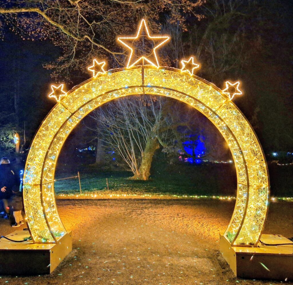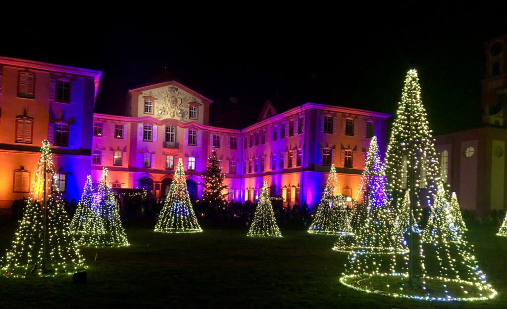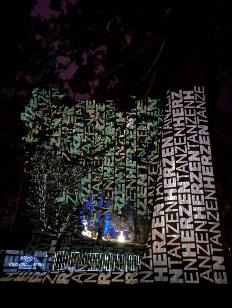 Der funkelnde Rundweg über die Mainau war an diesem Abend wunderschön erleuchtet. In diesem Winter führt der romantische Spaziergang über eine magische Route mit ganz neuen Lichterwelten. Besonders eindrücklich war die Baumallee: Sie erstrahlte in einem wechselnden Farbenspiel, dazu tanzten Schriftzüge an den Baumstämmen hoch, wie leise Botschaften im Dunkeln.