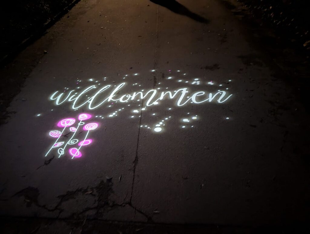 Nicht nur über dem Eingang wurden wir festlich begrüsst: Auch auf den Boden wurden liebevoll Projektionen gezaubert, die uns gleich ein Lächeln ins Gesicht zauberten.