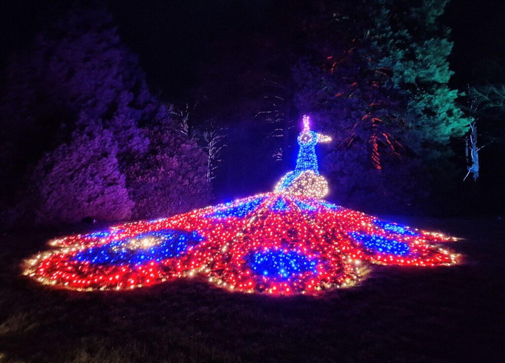 Wer schon einmal auf der Blumeninsel zu Besuch war, kennt bestimmt den Pfau aus Blumen. Auch er durfte nicht fehlen, dieses Mal festlich und farbig beleuchtet, als funkelnder Gruss aus der Mainau-Welt.