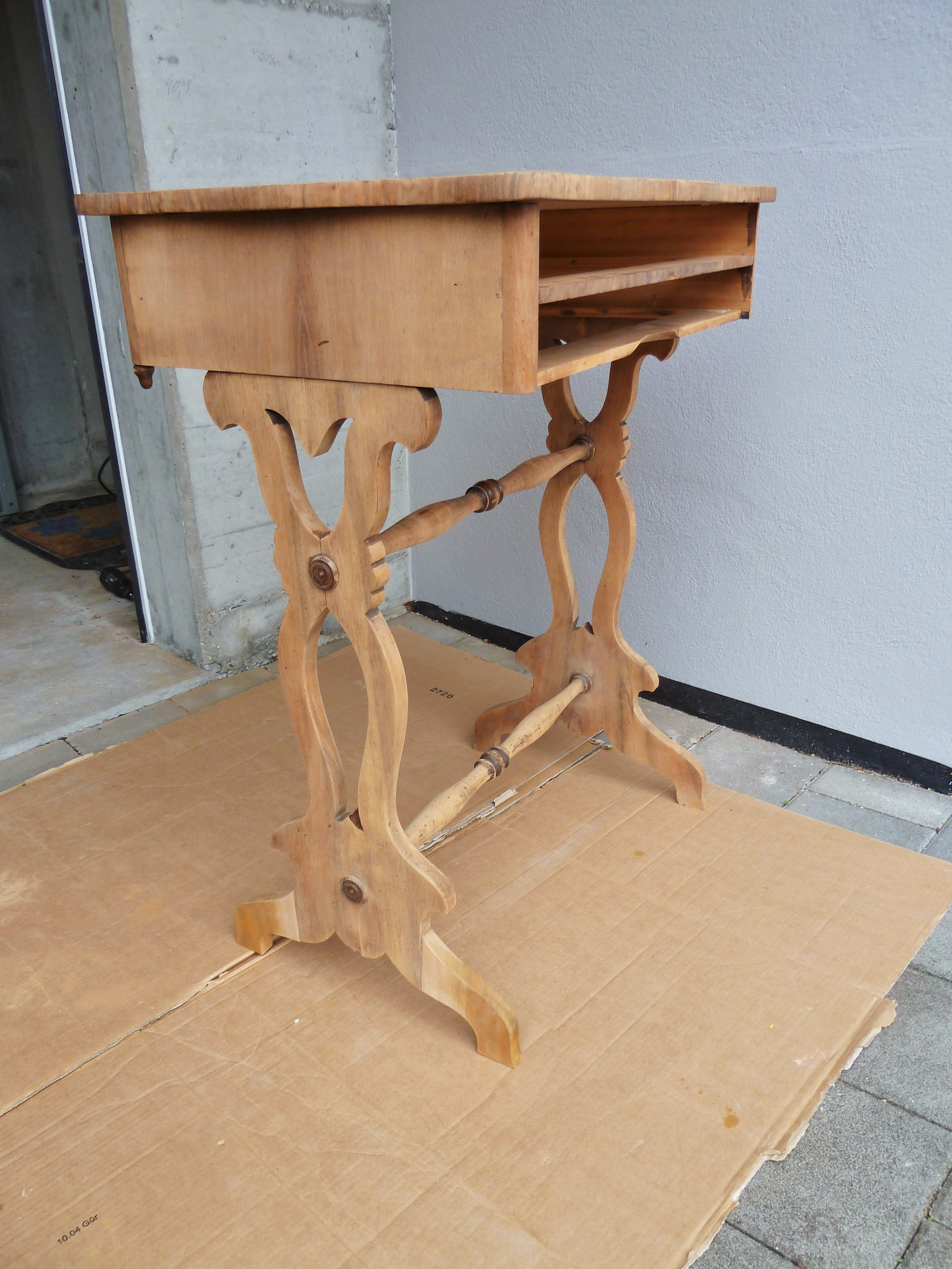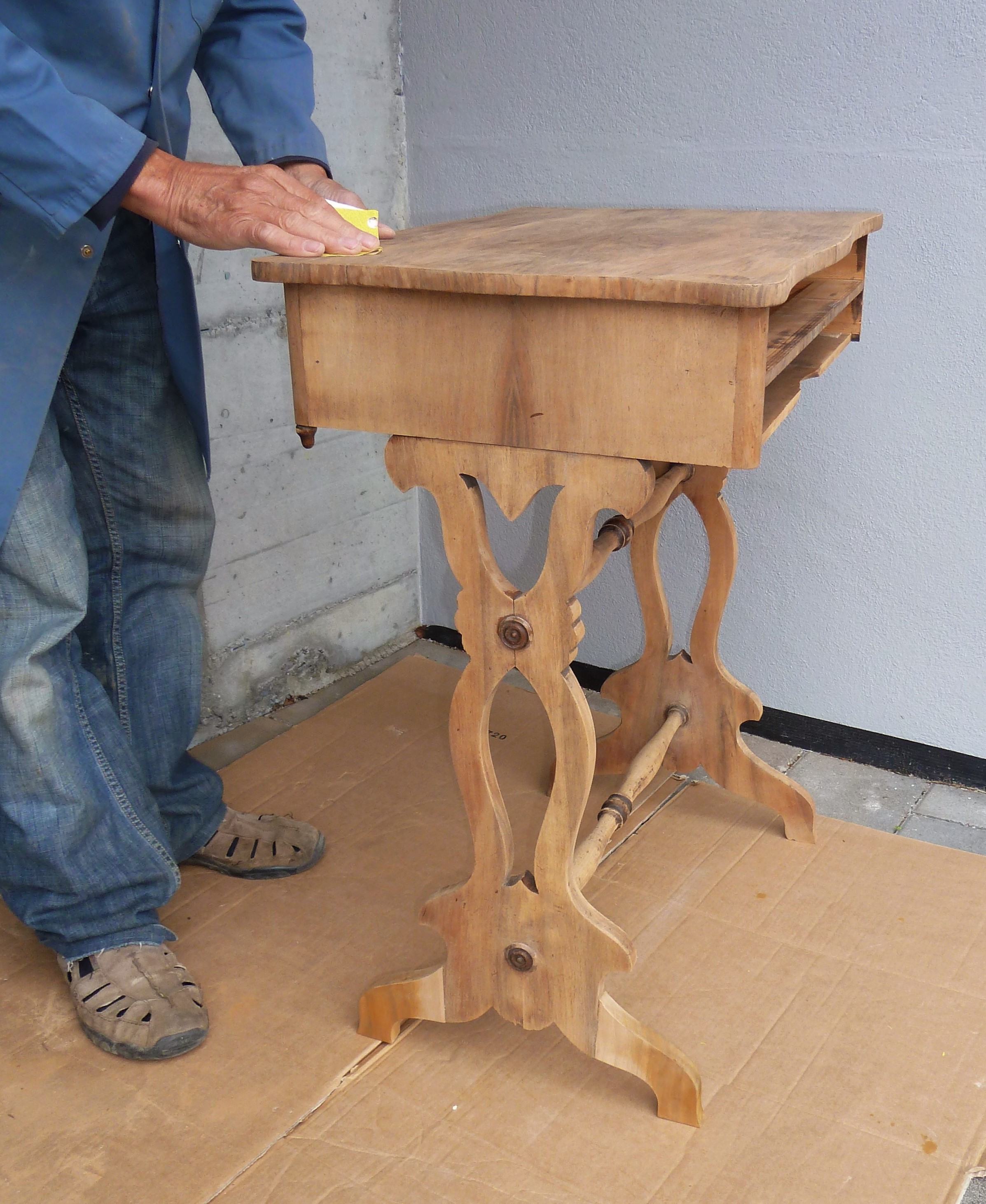 Als ich es bei der Räumung zu mir nahm, waren die Füsse auf einer Seite abgebrochen. Ein ganz lieber Schreiner in der Verwandtschaft, nahm ein Muster und fertigte mir die fehlenden Teile an. Er bereitete alles vor, mit Dübel und Schrauben, mein Mann konnte es nur noch zusammenfügen. Die extra Anfertigungen passten ganz genau. Jetzt müsse es nur noch geschliffen und aufgefrischt werden- sagte ich. Das könne ich selber machen, meinte mein Göttergatte.