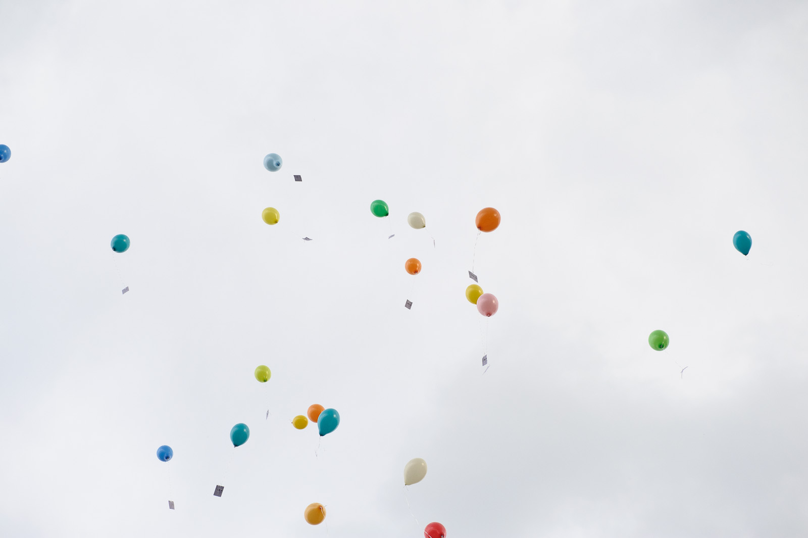 An die bunten Luftballone wurde von jedem Gast eine Postkarte gebunden. Auf die Karte wurde nebst dem Namen des Absenders, ein Geschenk für die beiden geschrieben, mit der Bitte an den Finder, die Karte an das Brautpaar zurück zu senden.