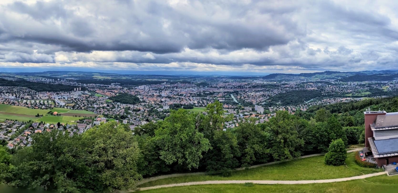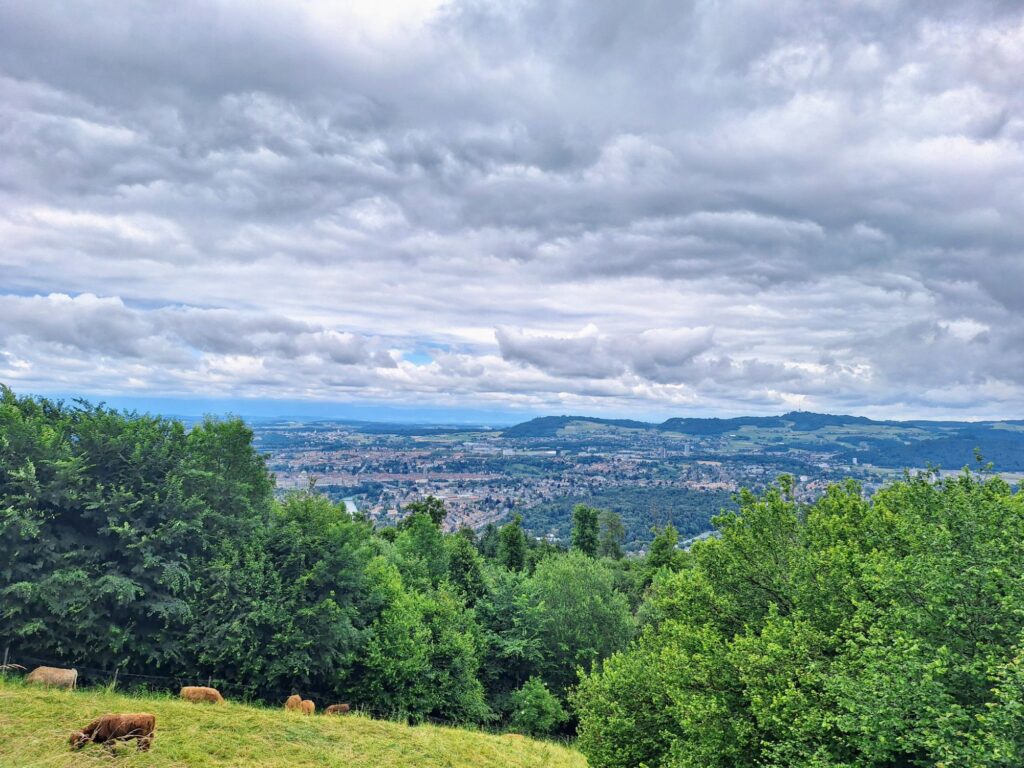 Irgendwann führt der Weg wieder aus der Schlucht hinaus, Richtung Dorf. Der Blick öffnet sich auf die Engadiner Dolomiten.