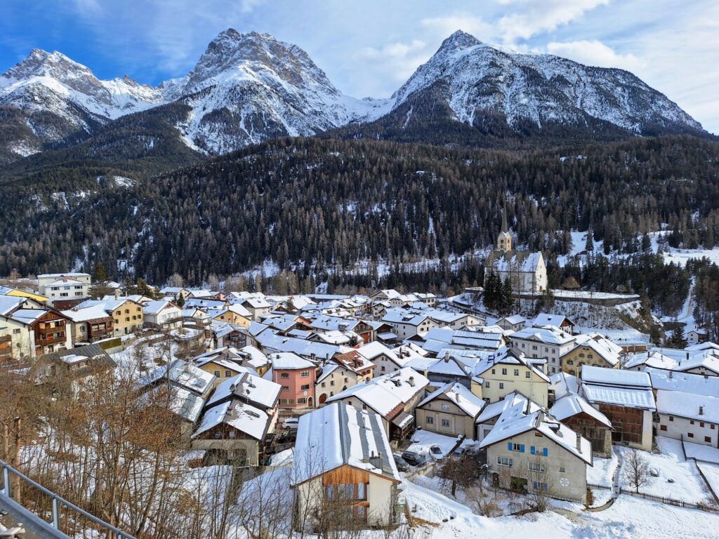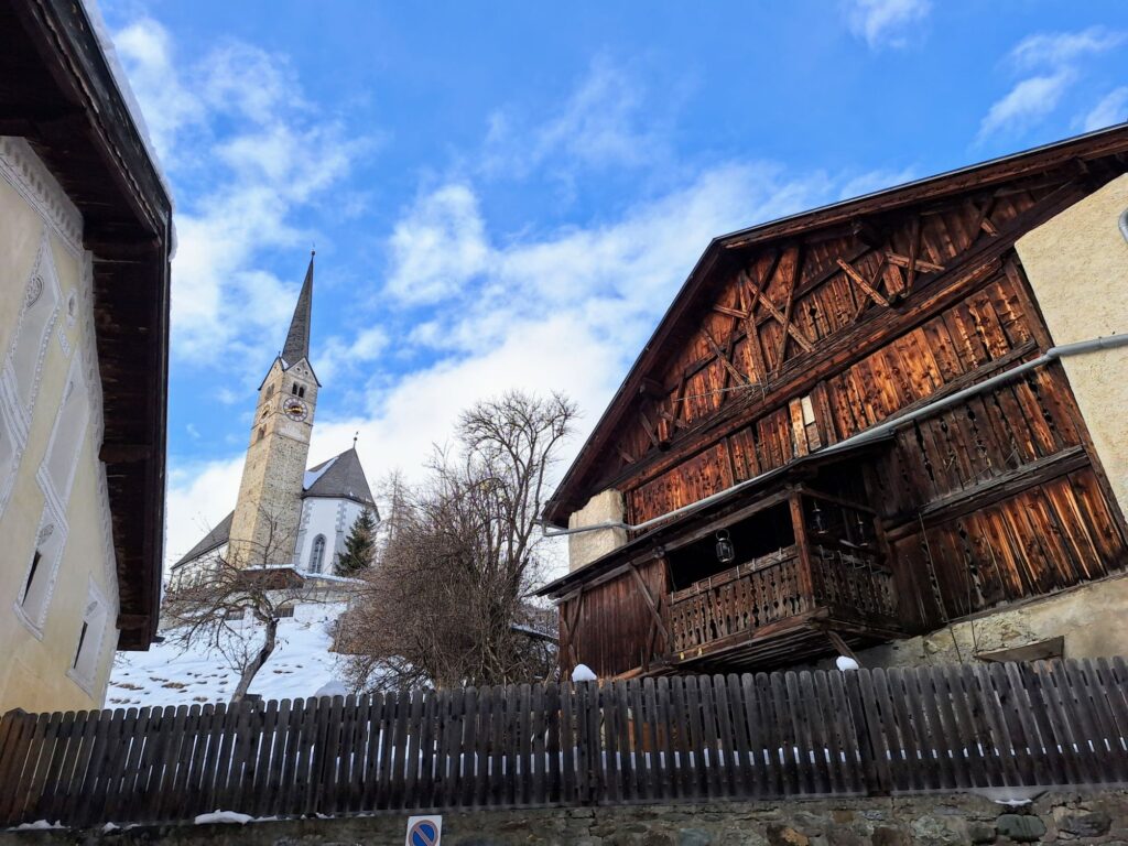Von weitem sieht man die Dorfkirche von Scuol, die auf einem Hügel hoch über dem Inn steht.