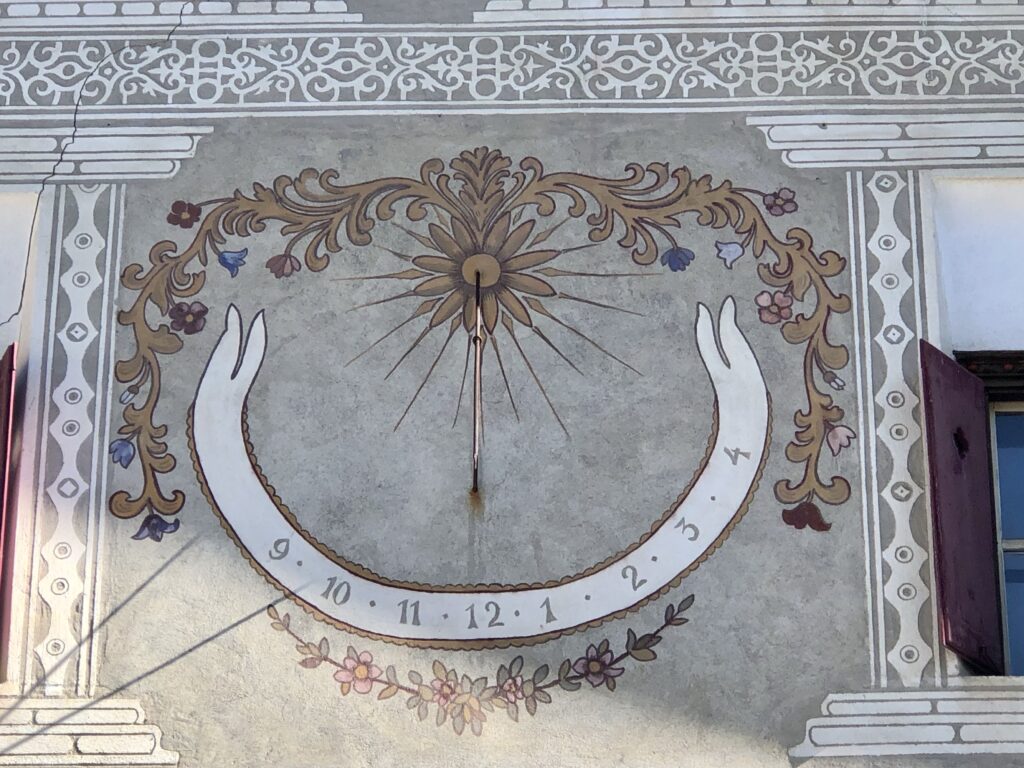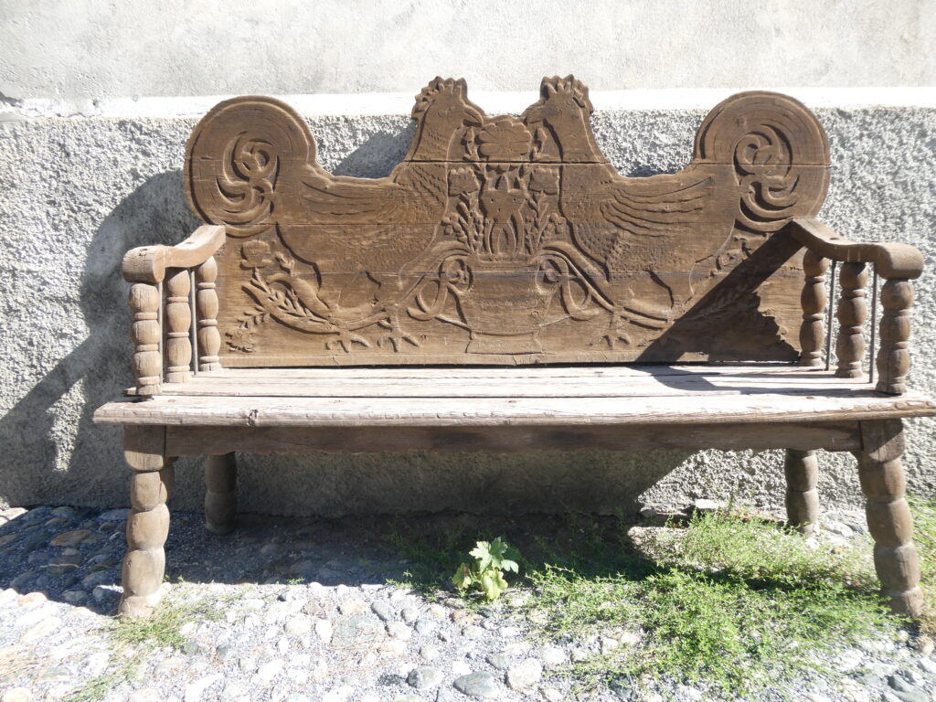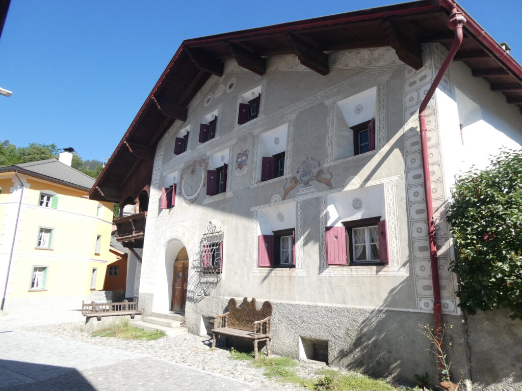 Bei diesem reich verzierten Haus gibt es viel zu bestaunen. Nebst den kunstvollen Sgraffitos ziert eine Sonnenuhr die Fassade. Aber unser Augenmerk galt der wunderschön geschnitzten Bank vor dem Haus.
