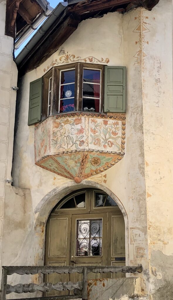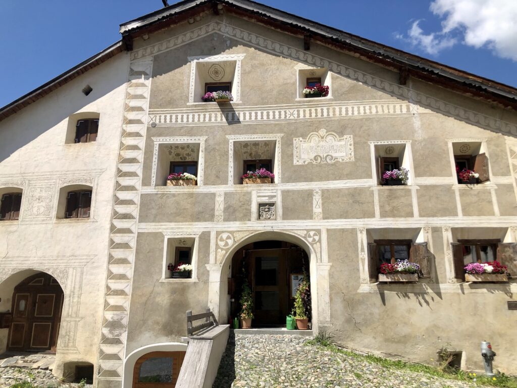 Auf einem Spaziergang im alten Dorfteil von Scoul trifft man auf ganz viele typische Engadinerhäuser mit ihren reich verzierten Sgraffito Fassaden.