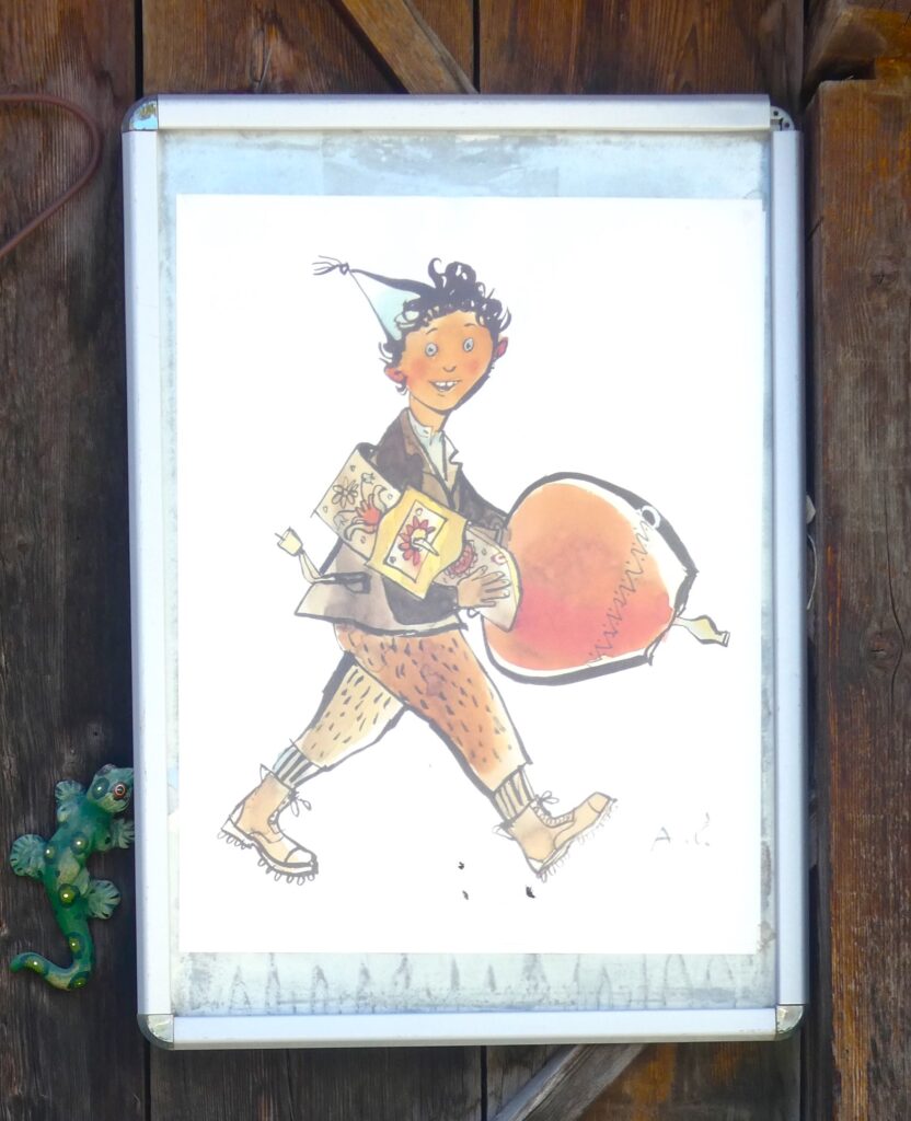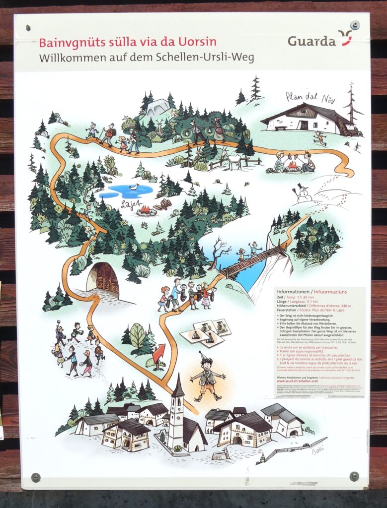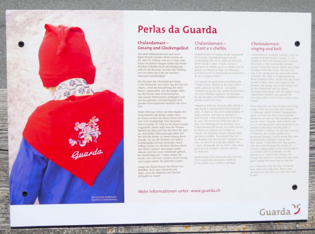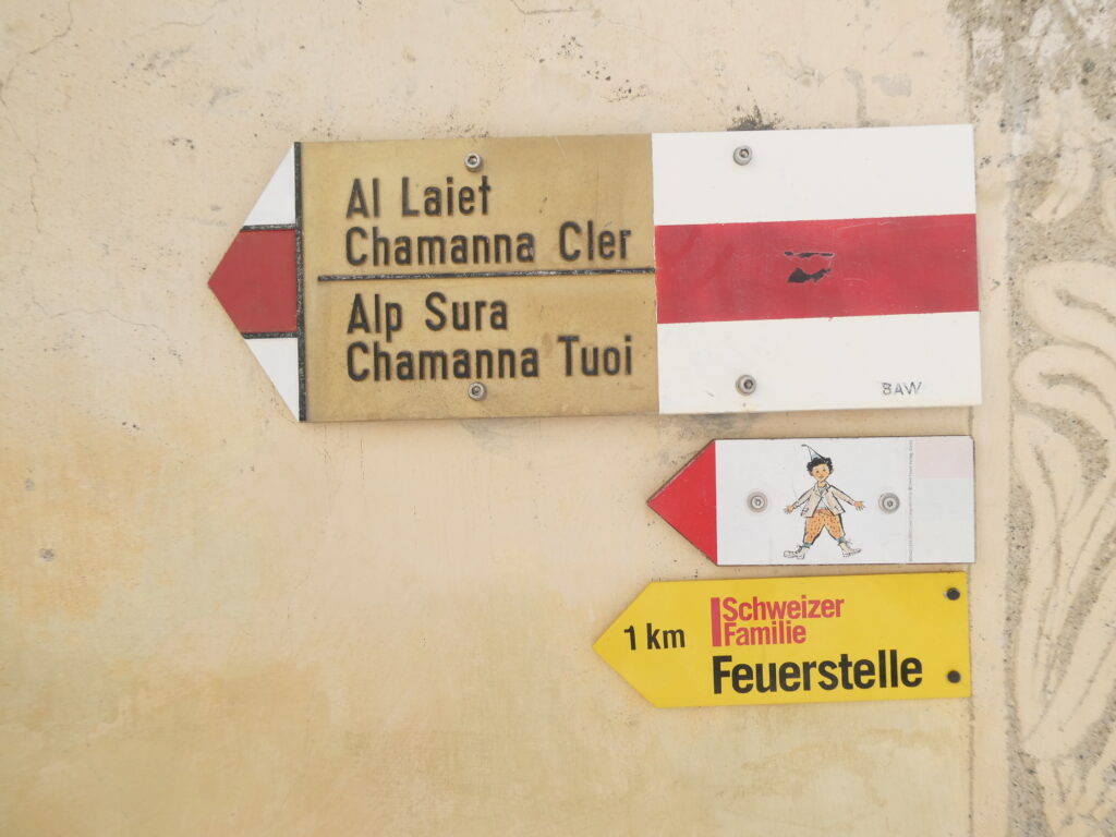 Obwohl mir die Inschrift auf einem der Schilder unbekannt blieb – mein Rätoromanischkenntnisse sind begrenzt –, ist bekannt, dass der Wolf in der Legende den „Schellen Ursli“ rechtzeitig zum Umzug weckte.