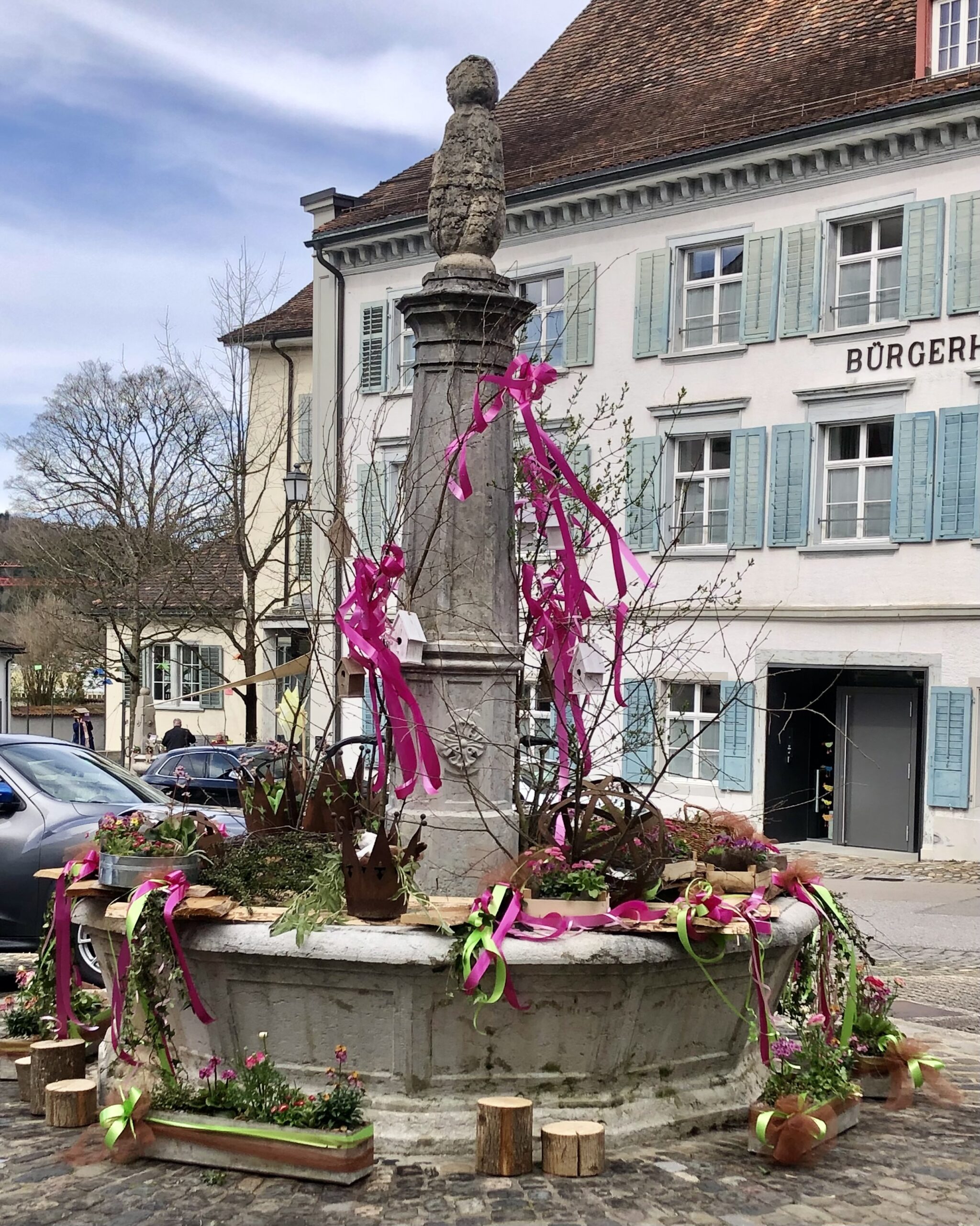 Beim Fotografieren der Osterbrunnen waren es nicht die Besucher, die mich störten, sondern die Autos, die bis dicht vor die Brunnen geparkt wurden.