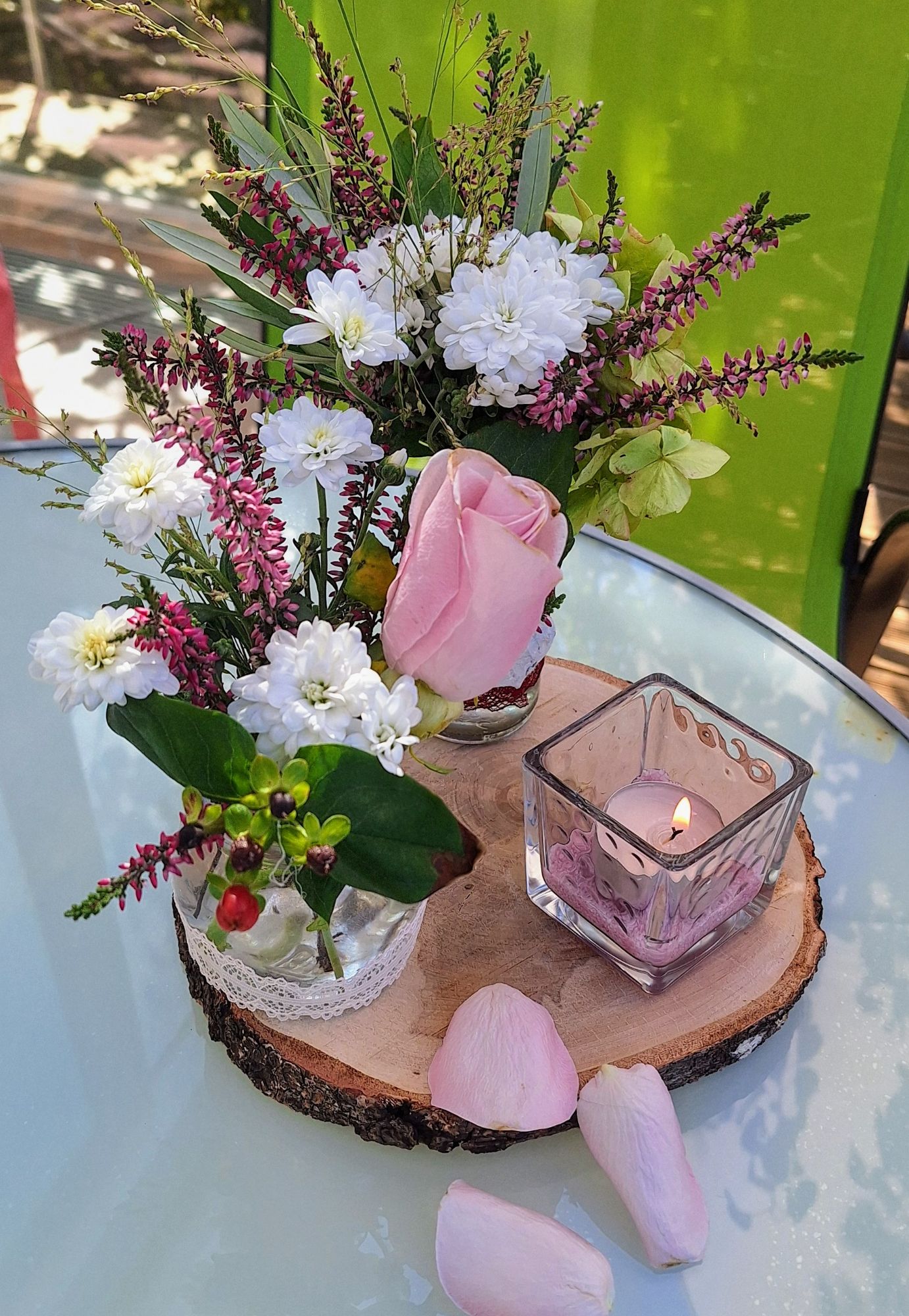 Die letzten schönen Blümchen unserer Tischdeko habe ich in zwei kleine Gläser gestellt und sie zusammen mit einem Teelicht auf einem Holzuntersetzer arrangiert. Nach drei Wochen steht es immer noch auf unserem Terrassentisch und erfreut uns täglich.