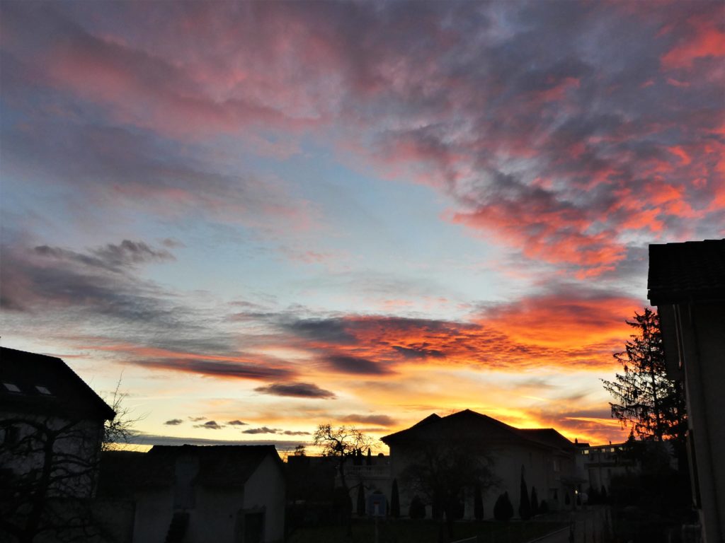 Das war für uns der aufregendste Monat des Jahres. Mitten im Advent wurden wir stolze Grosseltern eines süssen Adventsbabys. Während dem langen Warten verbrachte ich viel Zeit mit dem werdenden Mami, sei das bei einem Spaziergang am See, mit einem Besuch der geschmückten Tannenbäume, die sich bei Dunkelheit so schön im See spiegeln oder über dem Nebel an der wohltuenden Sonne. Der Besuch des Weihnachtsmarktes und die Krippenausstellung stimmten mich auf den Advent ein. Aber am schönsten ist es zu Hause im geschmückten Wintergarten mit feinen Guetzli. Ich bastelte fleissig Weihnachtskarten, die hoffentlich alle angekommen sind. Eine liebgewordene Tradition bei uns ist, am 4. Advent das Konzert in der Kirche zu besuchen und sich auf die Festtage einzustimmen. Die Krönung aber war diesen Monat die Geburt unseres kleinen Wunders mit dem wunderschönen Morgenhimmel an diesem Tag.