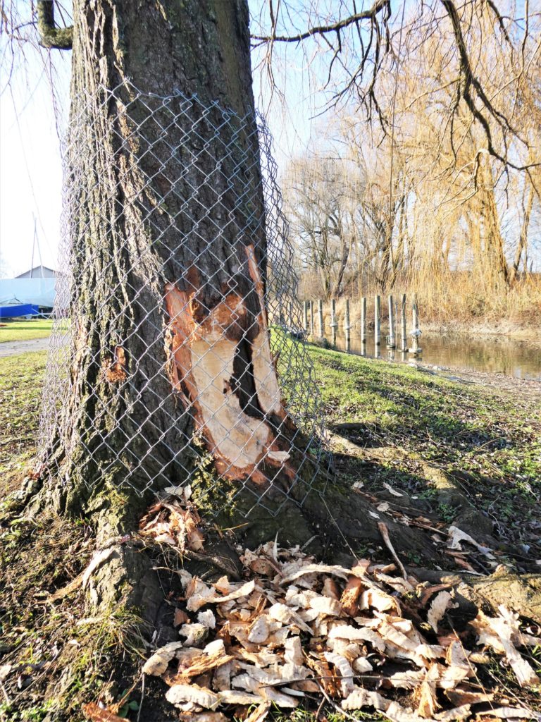 Aber wenn man näherkommt, sieht man wer da am Werk war. Dem Nager wurde eine Barriere gebaut. Es wäre aber auch zu schade, wenn die Prachtsweide vom Biber gefällt worden wäre.