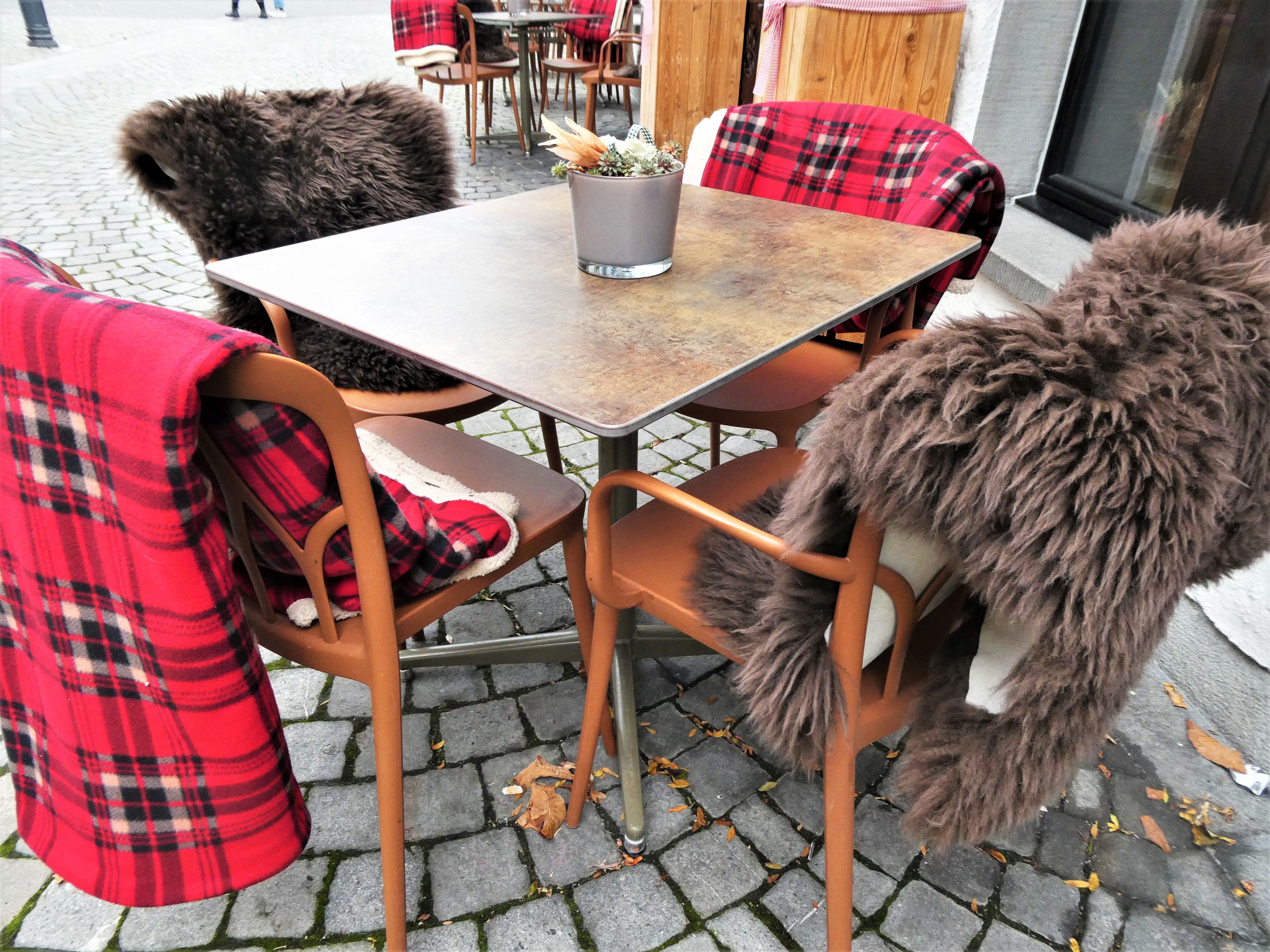Um draussen zu sitzen, war es uns doch zu kalt, auch wenn der Platz sehr einladend war mit den warmen Decken.