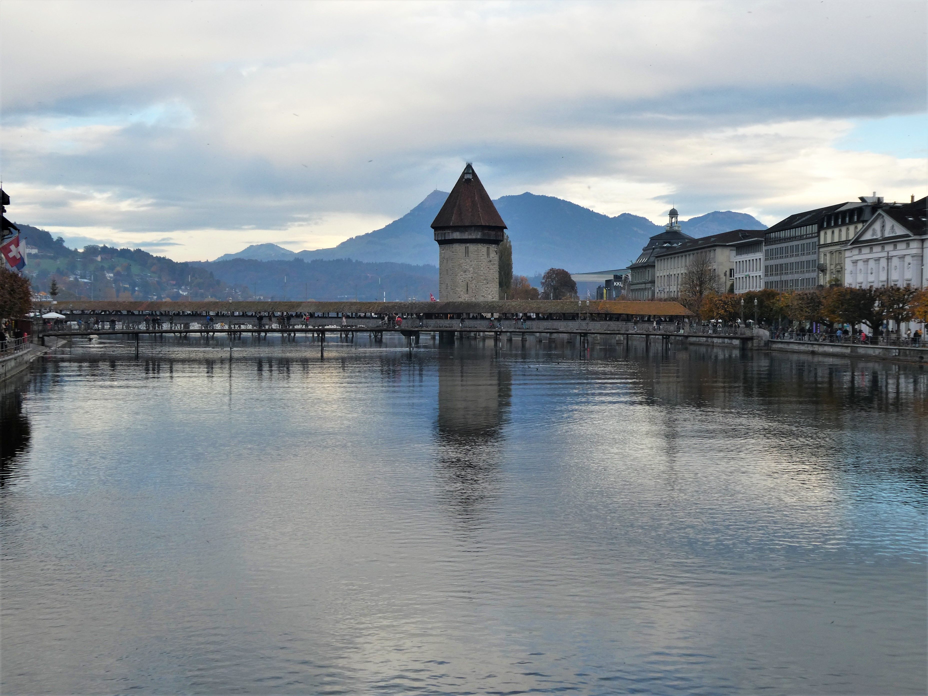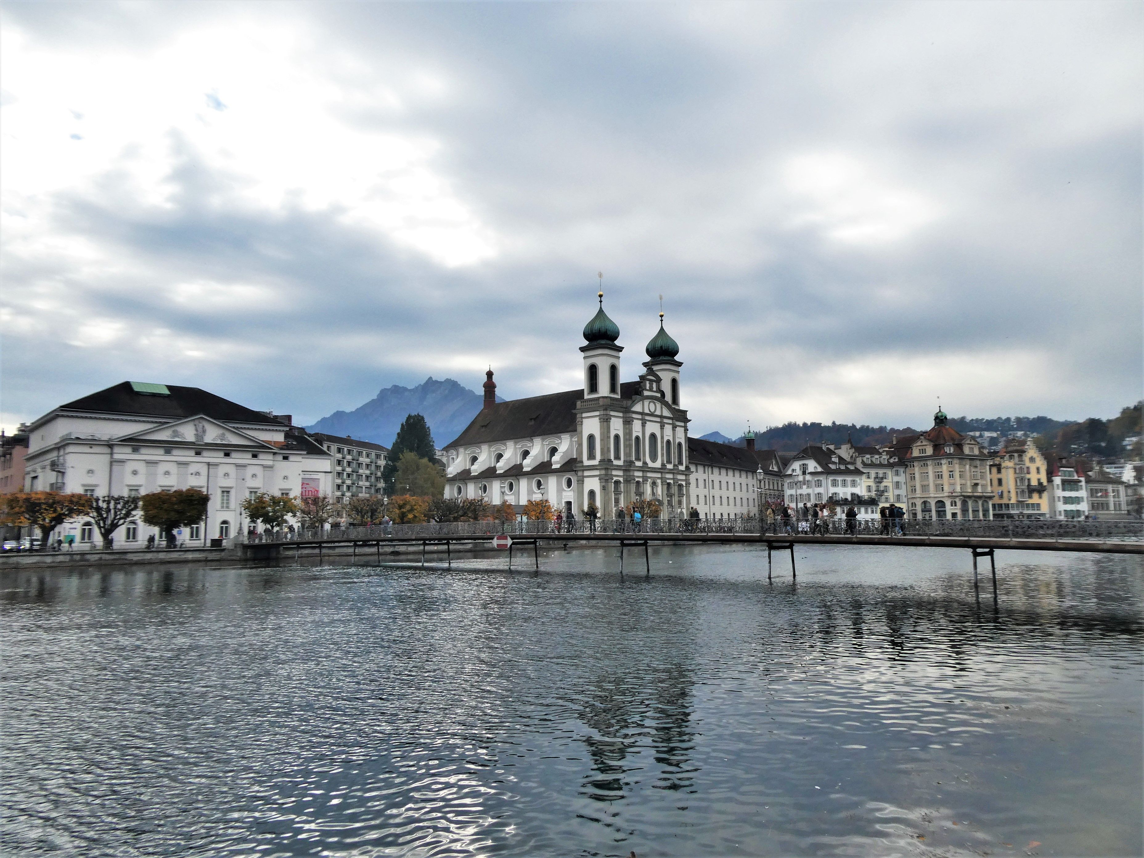 Dank den vielen Brücken über die Reuss kann man bequem von einem Ufer zum anderen flanieren. Hier der Blick zur Jesuitenkirche mit dem Pilatus, den Hausberg von Luzern, im Hintergrund,