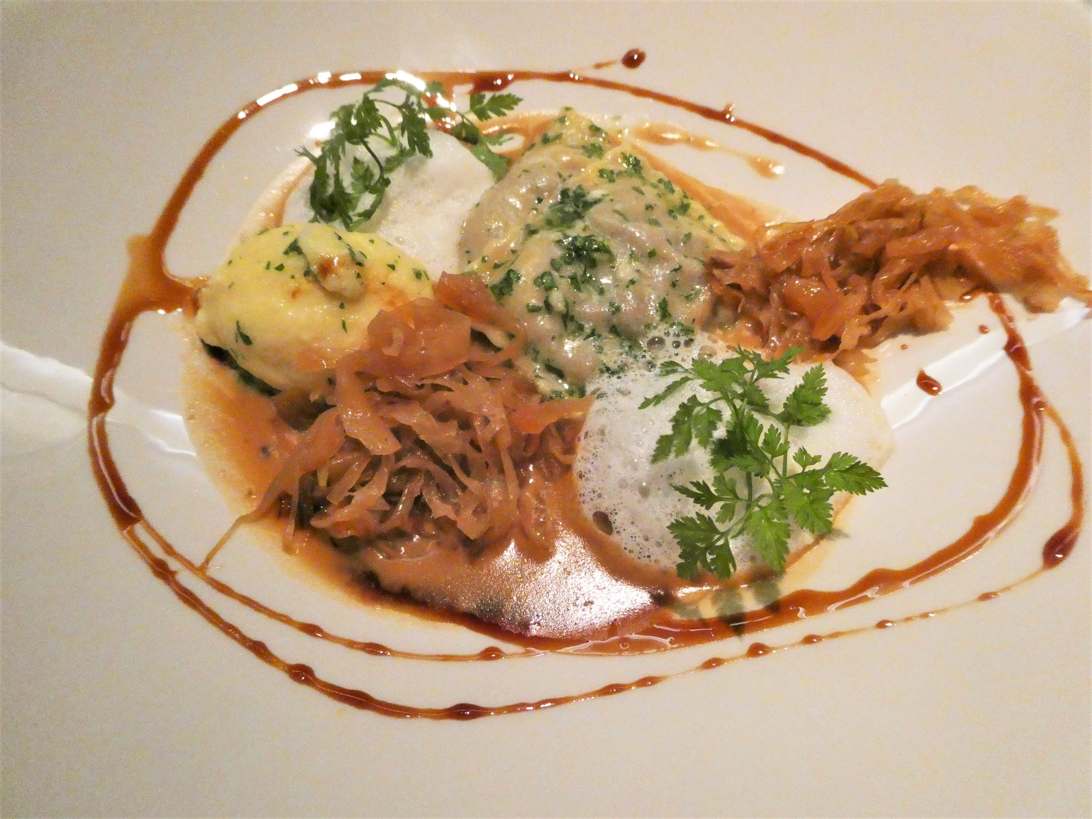 Nach dem langen Stadtbummel und vor dem Konzert gönnten wir uns noch eine Stärkung. Als Gruss aus der Küche gab es ein Panna cotta aus Ziegenmilch mit Safranparfait. Zur Vorspeise gab es ein Felchentartar mit Brioche und Salat. Für mich gab es Ravioli mit Trüffelrahm und geräuchtem Topfen. Das karamellisierte Kraut dazu, war so gut, dass ich das unbedingt selbst auch Mal ausprobieren möchte. Als krönenden Abschluss ein Apfelstudelparfait.