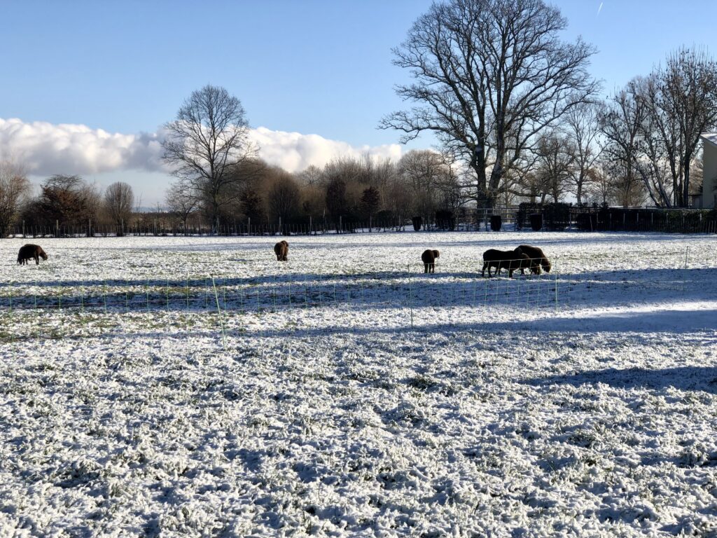 Wie gut, dass die Schafe ein dickes Fell haben. Sie stehen da, als könnte ihnen die Kälte nichts anhaben, und wirken wie kleine Wollinseln in der weissen Weite.
