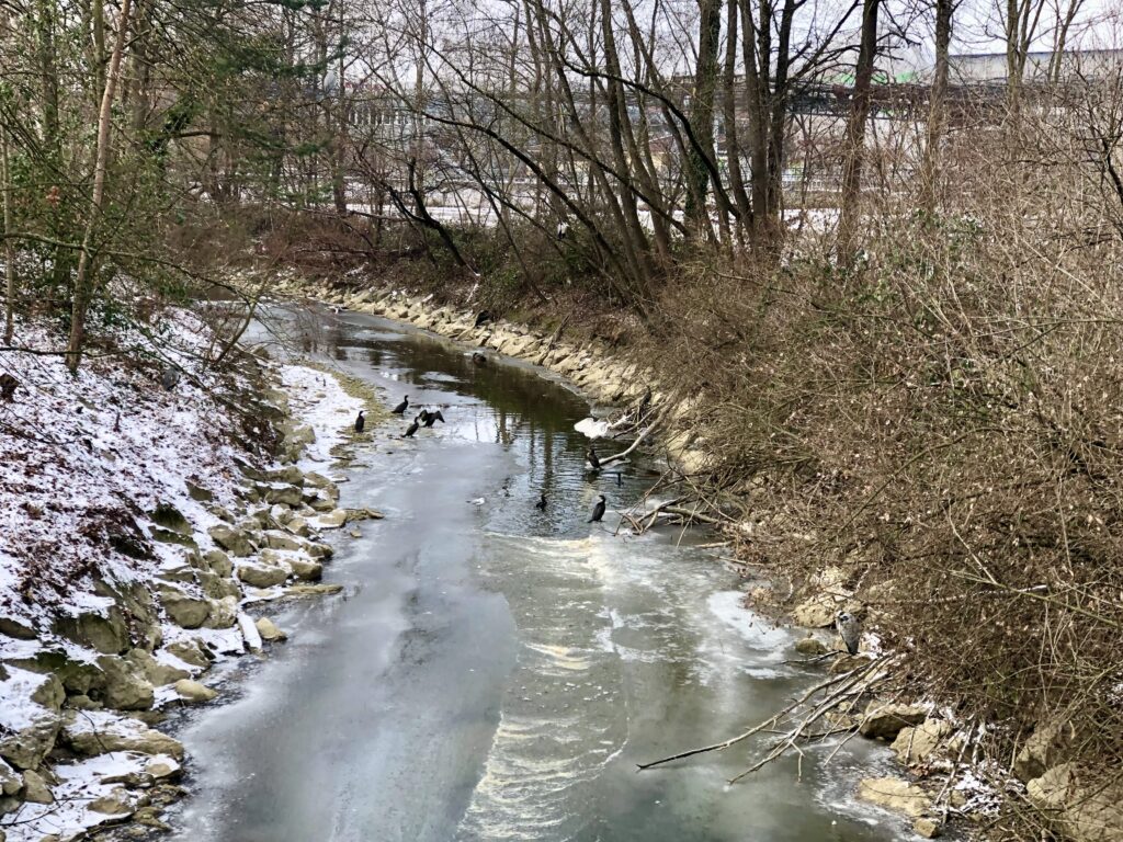 Dafür kann man die Kormorane gut beobachten wenn sie sich im Bach aufhalten und ihr Flügel ausbreiten und sich wärmen.