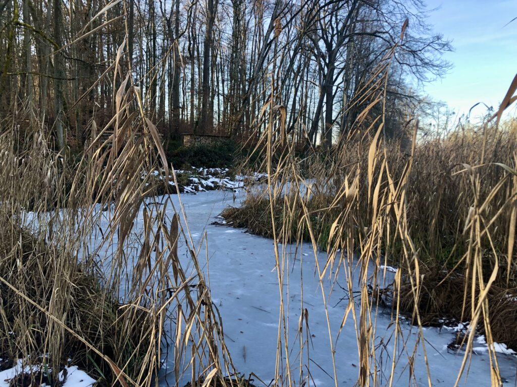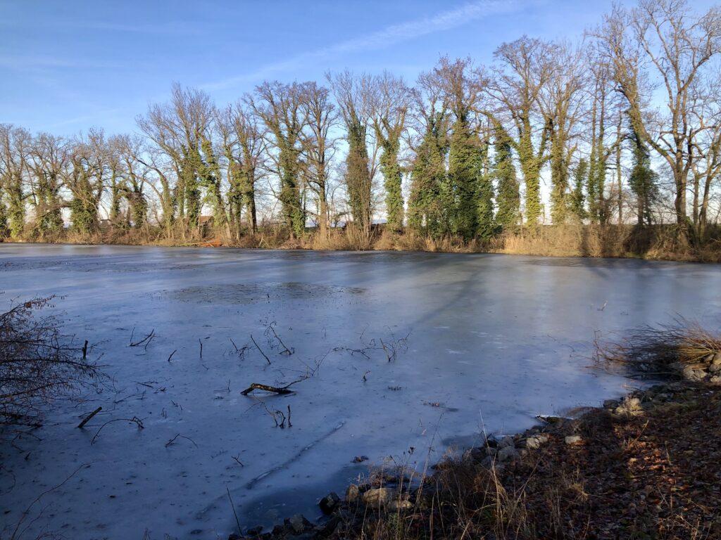sondern der ganze Weiher ist mit einer Eisschicht bedeckt