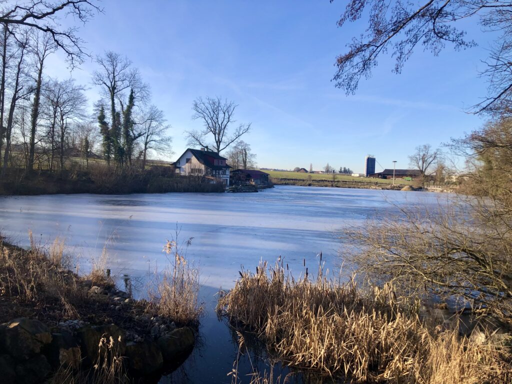 Fast den ganzen Dezember war es bei uns am See und auch an meinem Standort beim Weiher – grau. Oft wurde es den ganzen Tag nicht richtig hell. Kein Lieblingswetter von mir! Darum sieht man auf dem Foto auch nicht besonders viel. Viel lieber hätte ich euch ein Bild mit verschneiter Landschaft oder einem zugefrorenen Weiher gezeigt, so wie damals, als unsere Kinder noch klein waren und auf dem Eisfeld Schlittschuh laufen konnten.