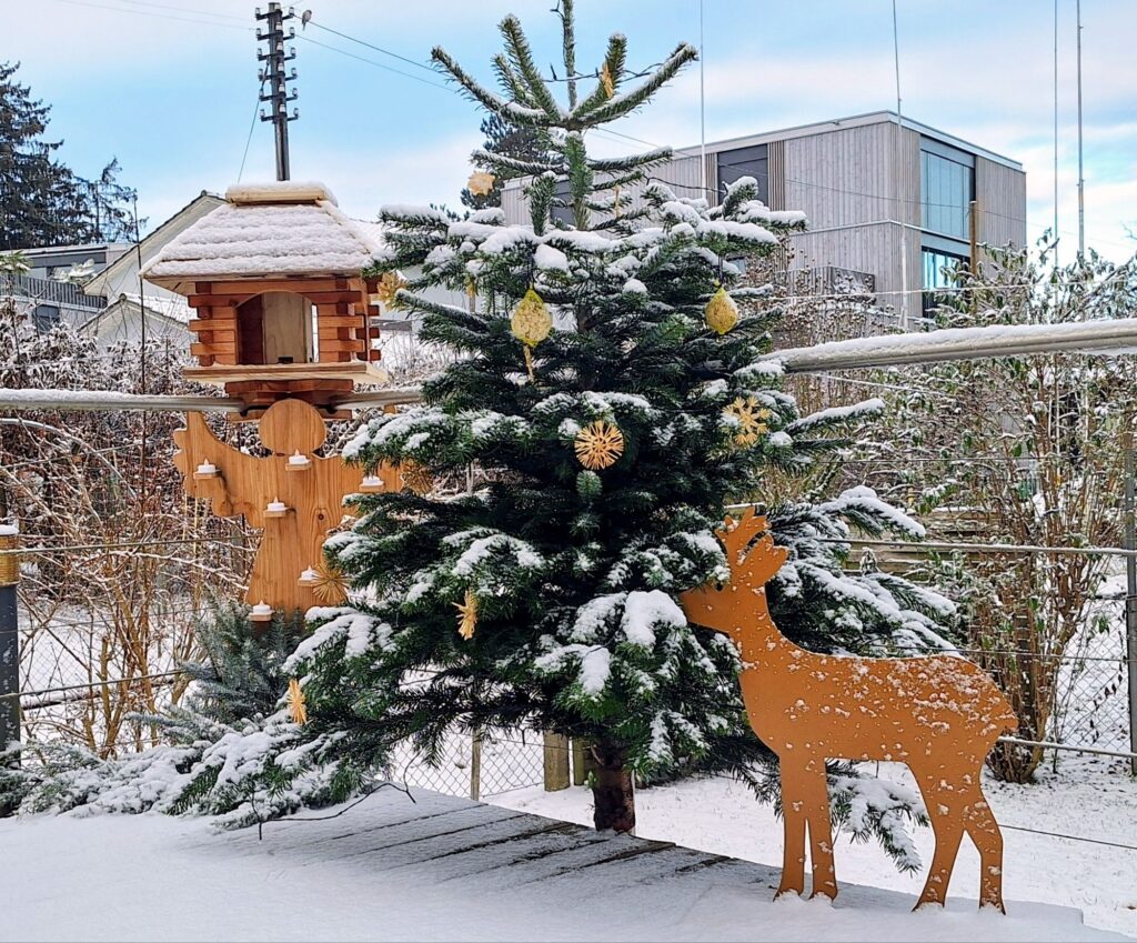 So schön winterlich sah unsere Terrasse den ganzen Advent nicht aus. Darum dürfen das Rehlein und der Engel noch ein wenig bleiben – als kleine Erinnerung daran, dass es manchmal erst nach den Feiertagen richtig gemütlich wird.