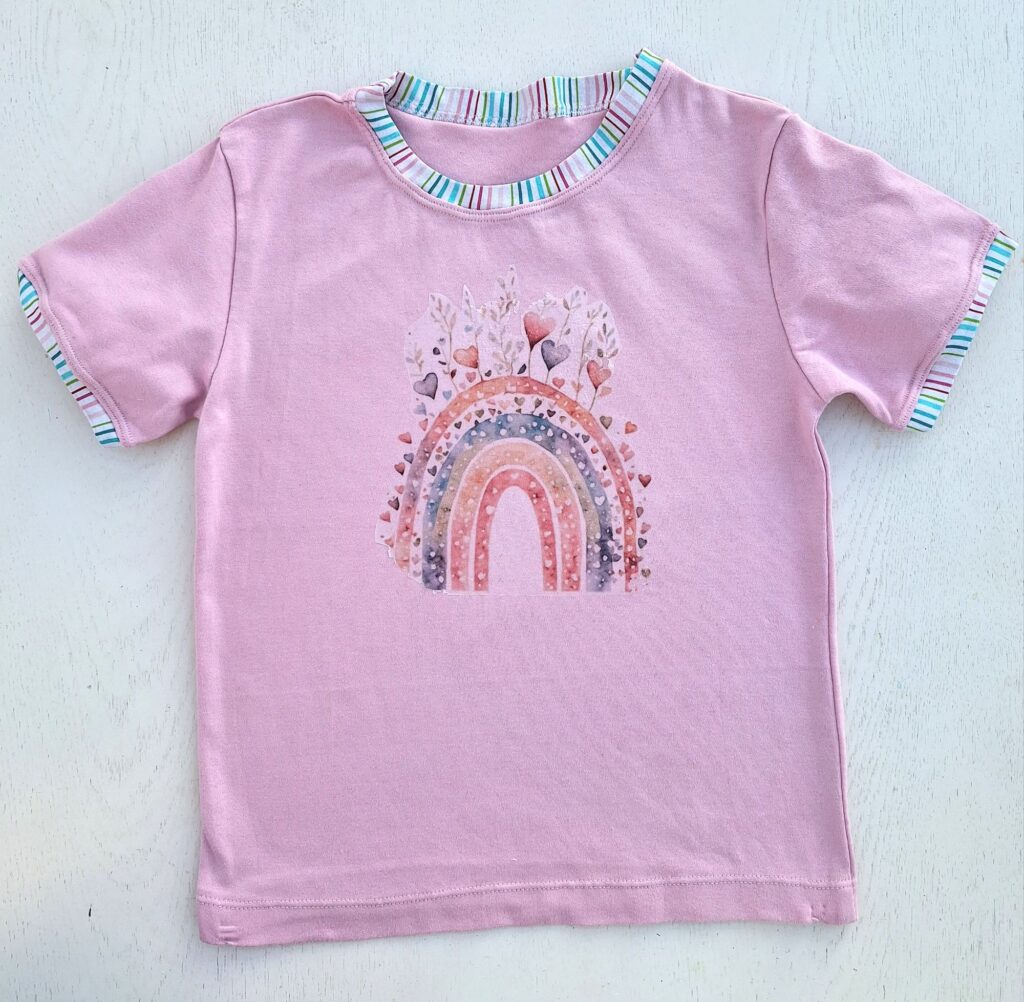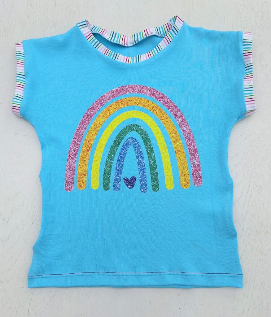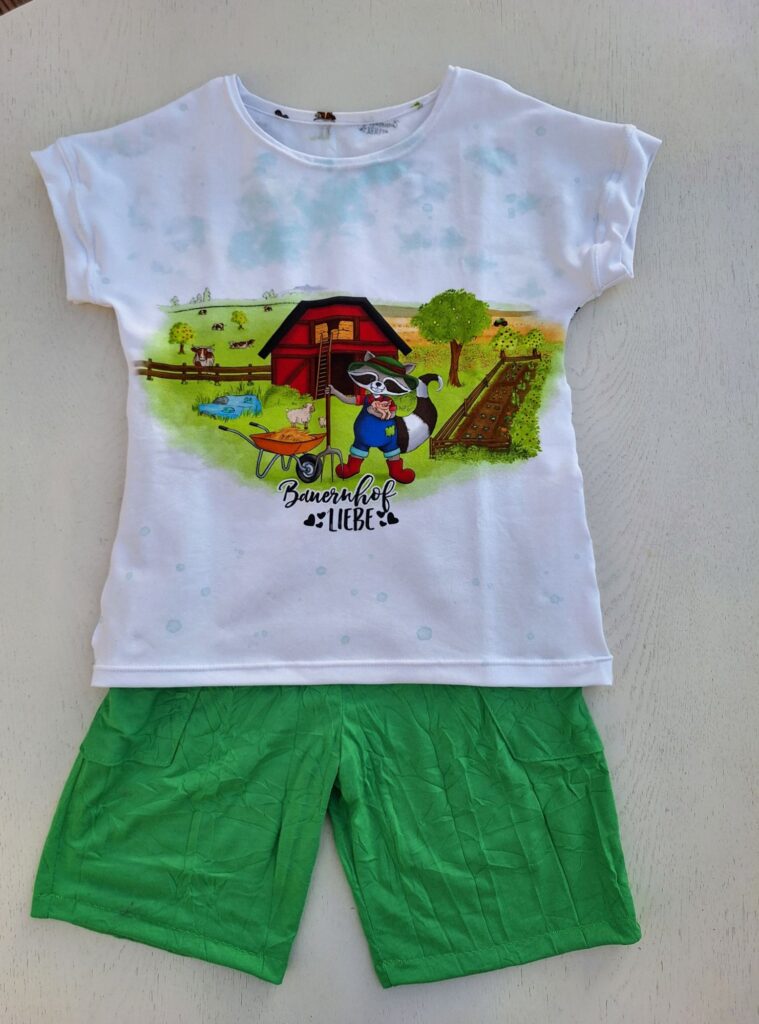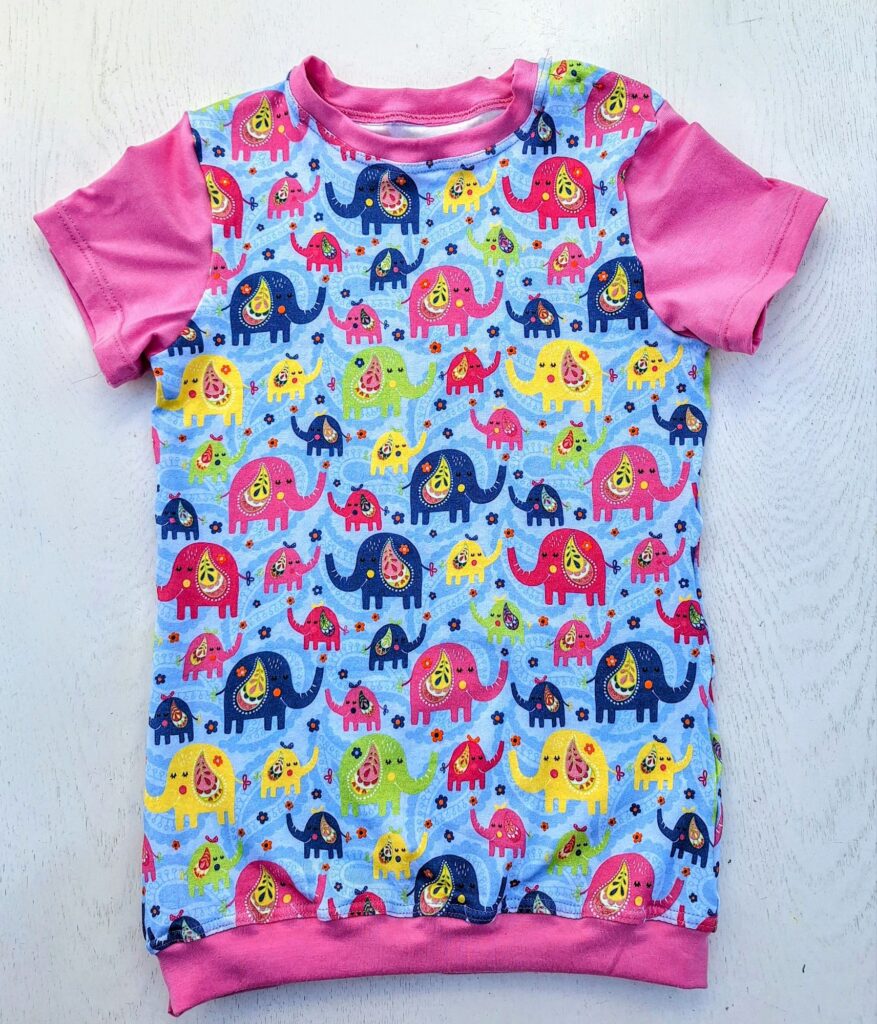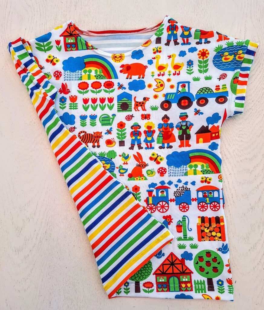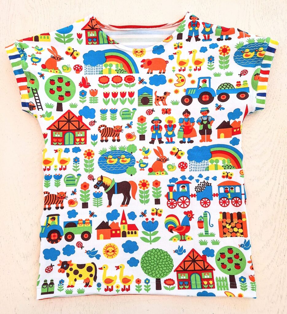 Einige von euch erinnern sich vielleicht: Unsere grosse Enkelin liebt bunte Kleidung. Zum Glück hatte ich noch ein Stück von ihrem Lieblingsstoff mit dem Bauernhof-Sujet übrig. Der gestreifte Stoff stammt vom selben Anbieter – so passen die Farben wunderbar zusammen. Daraus habe ich ihr ein Shirt genäht, das bei dem schönen Sommerwetter schon fleissig getragen wird. Sie hat sich sehr darüber gefreut! Auch das T-Shirt mit den farbigen Glitzer-Elefanten kam gut bei ihr an.