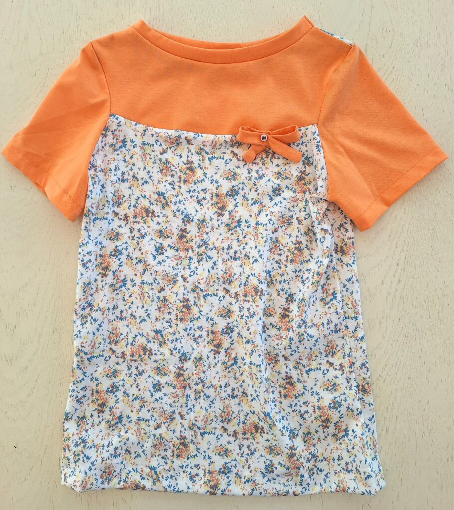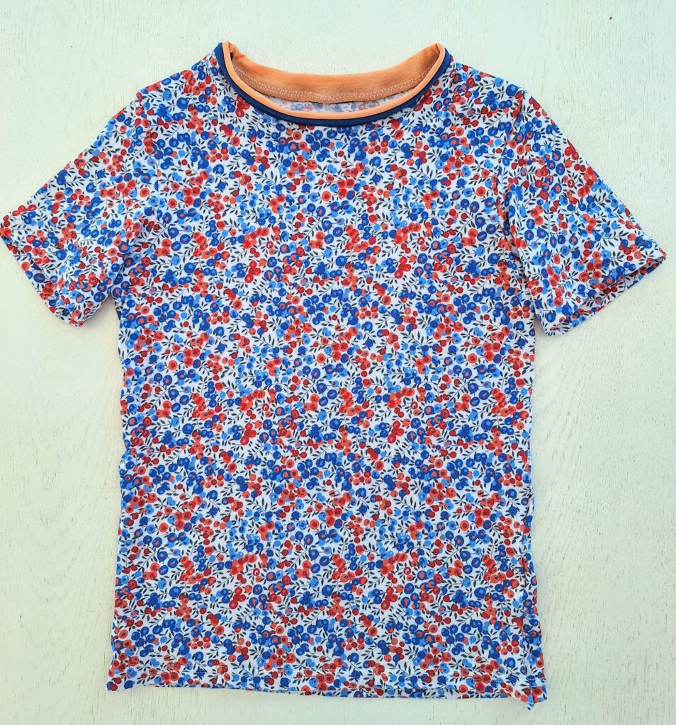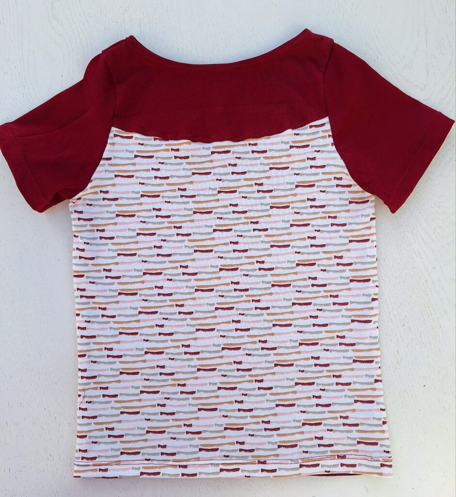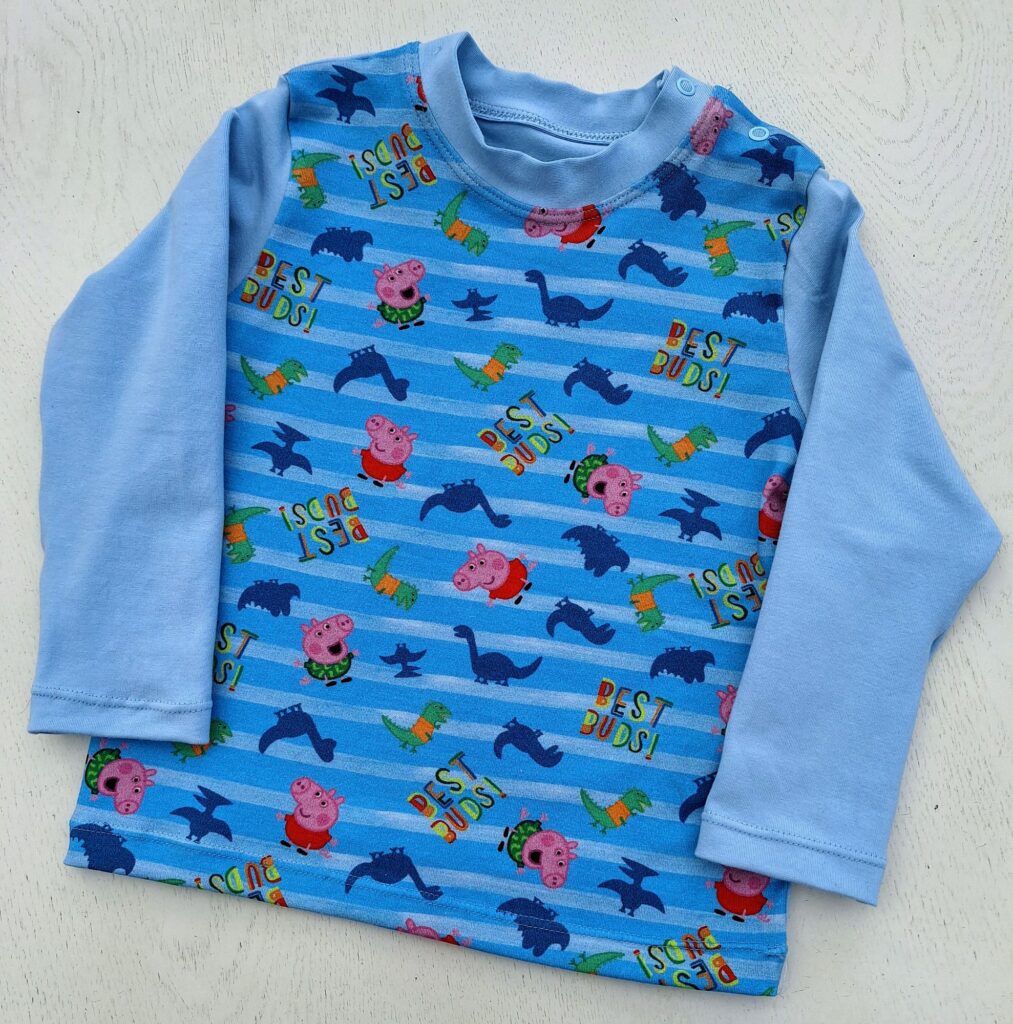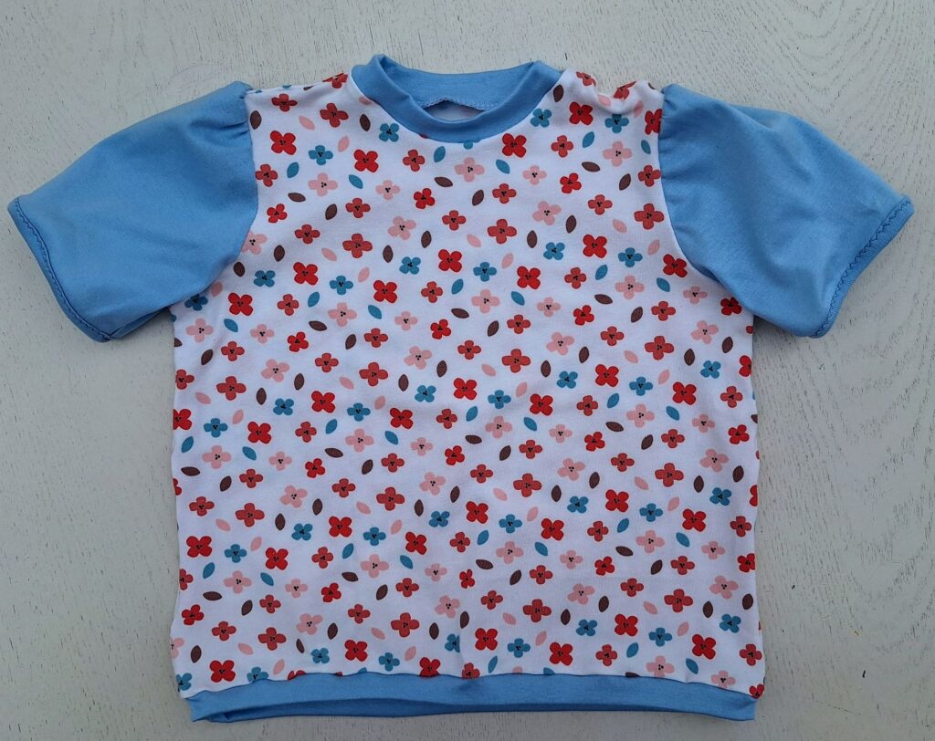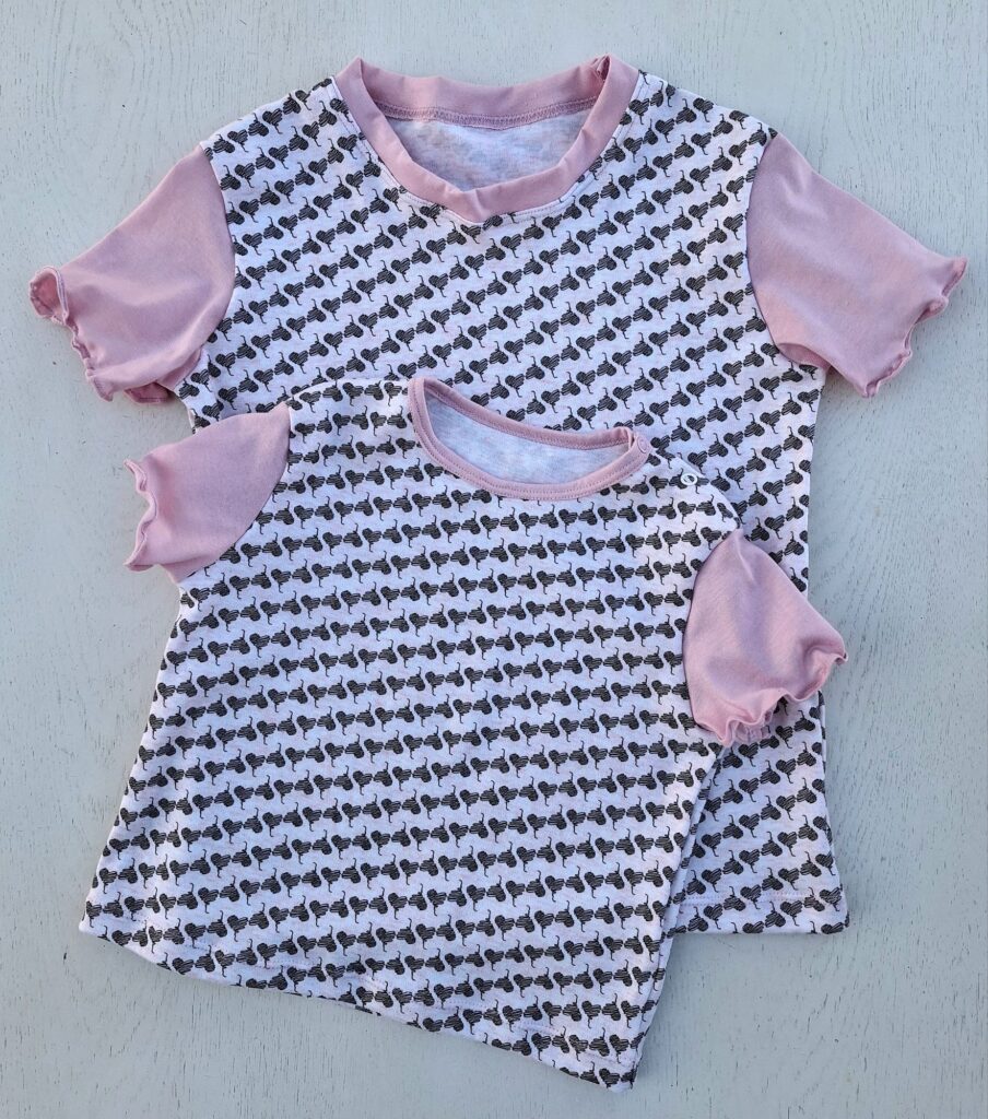 Einige von euch erinnern sich vielleicht: Unsere grosse Enkelin liebt bunte Kleidung. Zum Glück hatte ich noch ein Stück von ihrem Lieblingsstoff mit dem Bauernhof-Sujet übrig. Der gestreifte Stoff stammt vom selben Anbieter – so passen die Farben wunderbar zusammen. Daraus habe ich ihr ein Shirt genäht, das bei dem schönen Sommerwetter schon fleissig getragen wird. Sie hat sich sehr darüber gefreut! Auch das T-Shirt mit den farbigen Glitzer-Elefanten kam gut bei ihr an.
