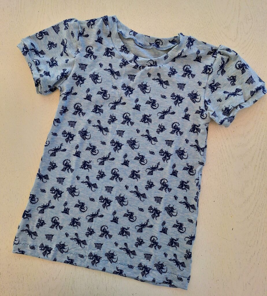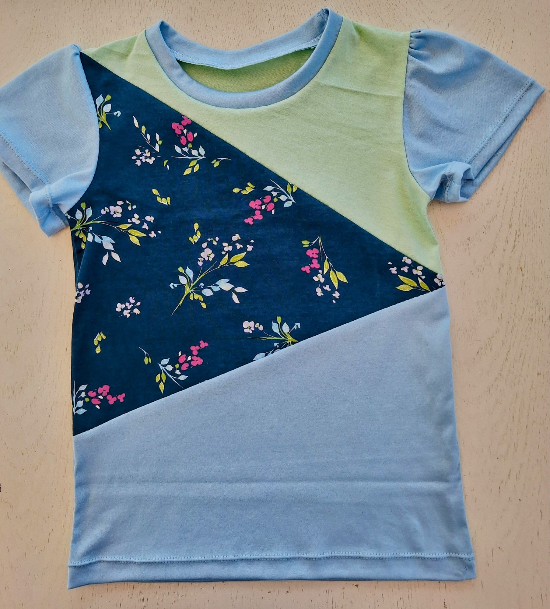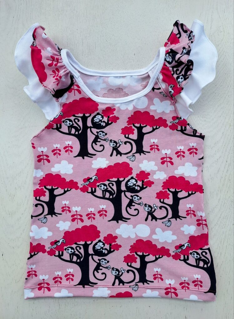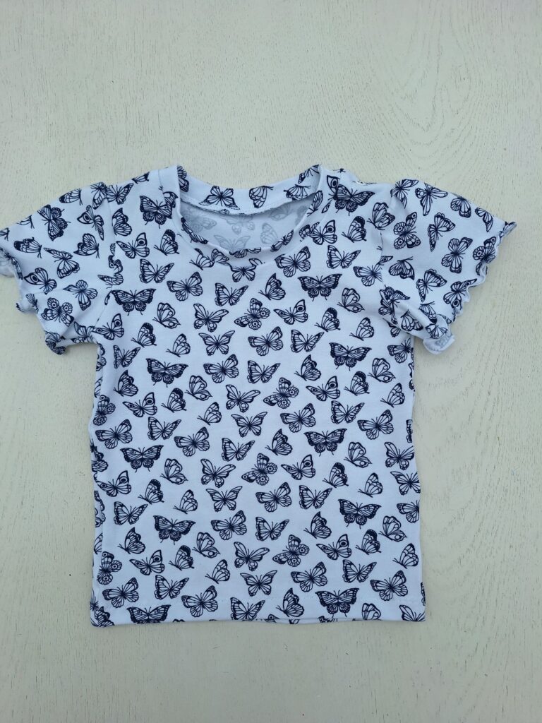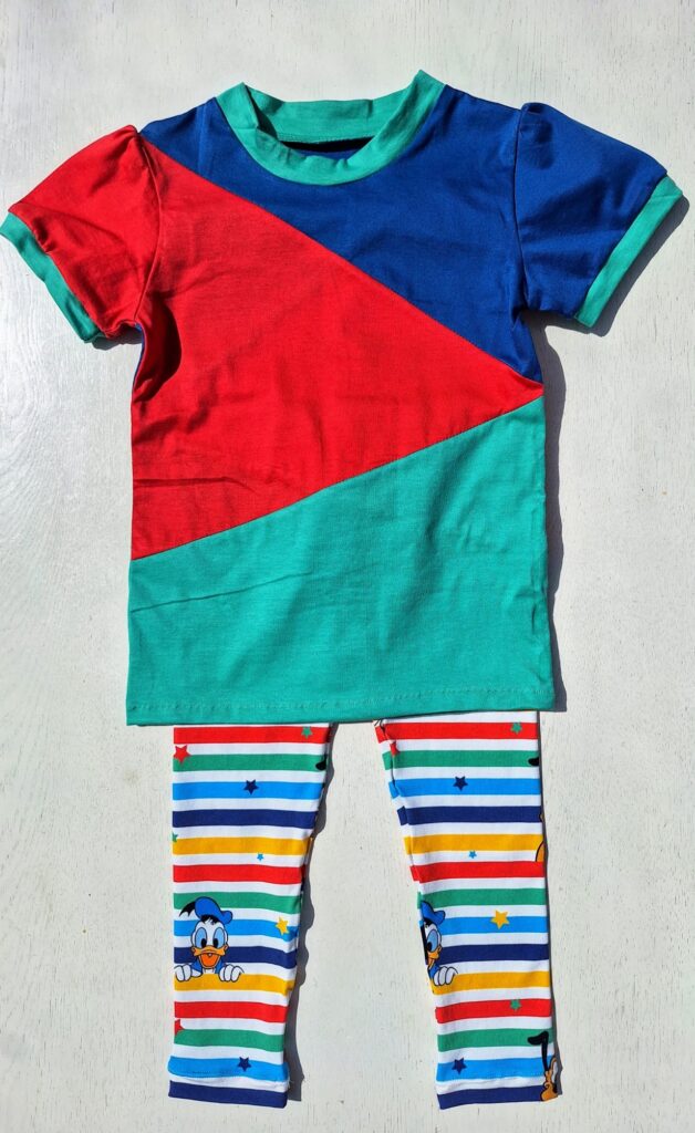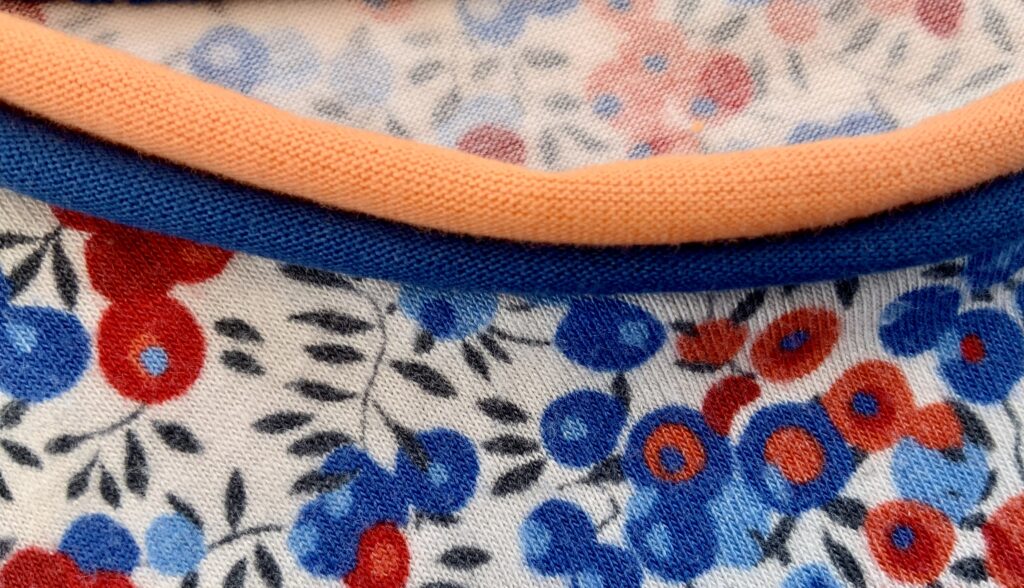 Einige von euch erinnern sich vielleicht: Unsere grosse Enkelin liebt bunte Kleidung. Zum Glück hatte ich noch ein Stück von ihrem Lieblingsstoff mit dem Bauernhof-Sujet übrig. Der gestreifte Stoff stammt vom selben Anbieter – so passen die Farben wunderbar zusammen. Daraus habe ich ihr ein Shirt genäht, das bei dem schönen Sommerwetter schon fleissig getragen wird. Sie hat sich sehr darüber gefreut! Auch das T-Shirt mit den farbigen Glitzer-Elefanten kam gut bei ihr an.