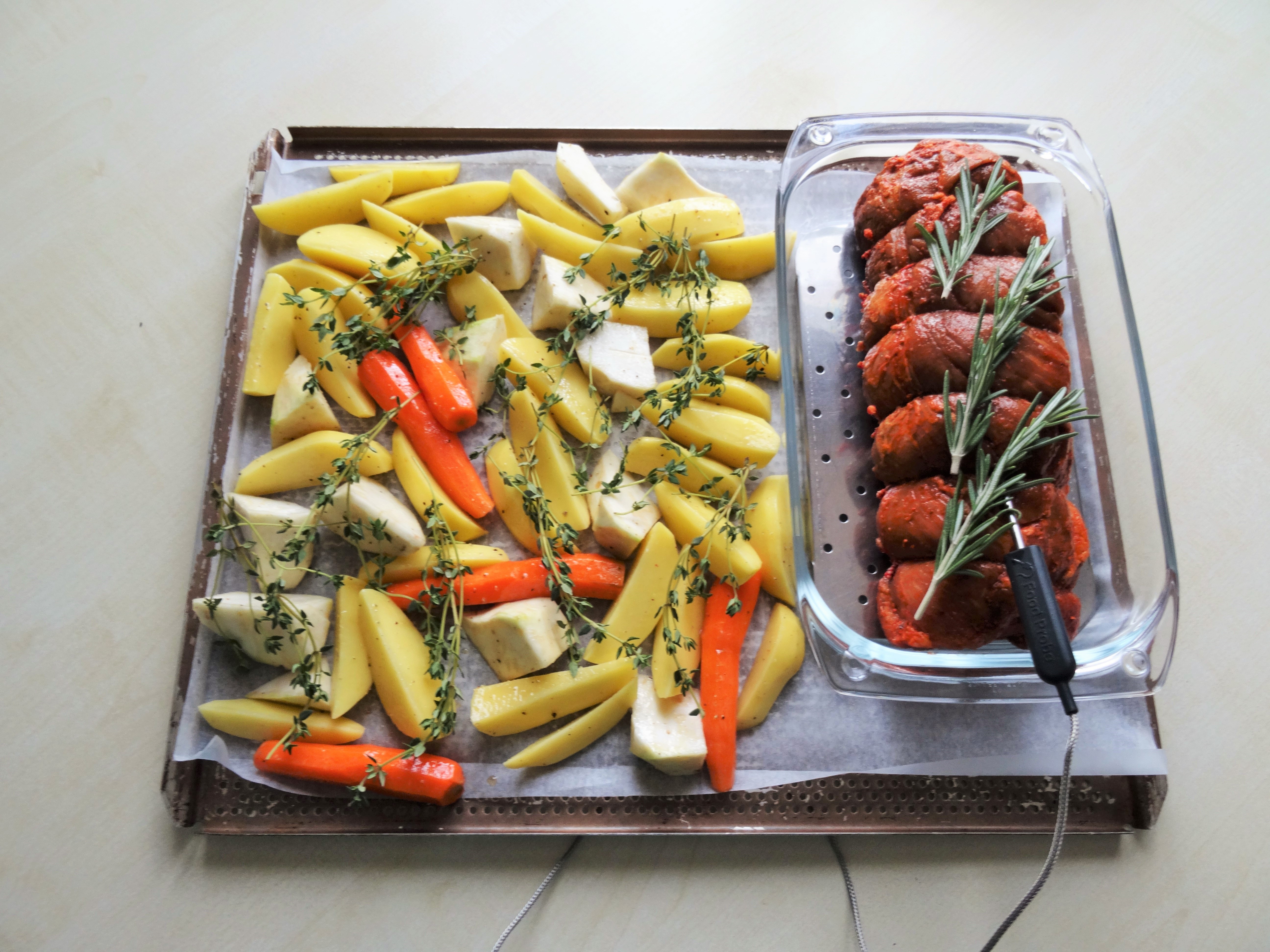 Der Hauptgang kann im Backofen zubereitet werden und soll mir so genügend Zeit für die frisch zubereiteten Speisen lassen. Es wird einen feinen Braten mit Kartollergratin geben, als Beilage werden Karotten, Blumenkohl und Broccoli serviert.