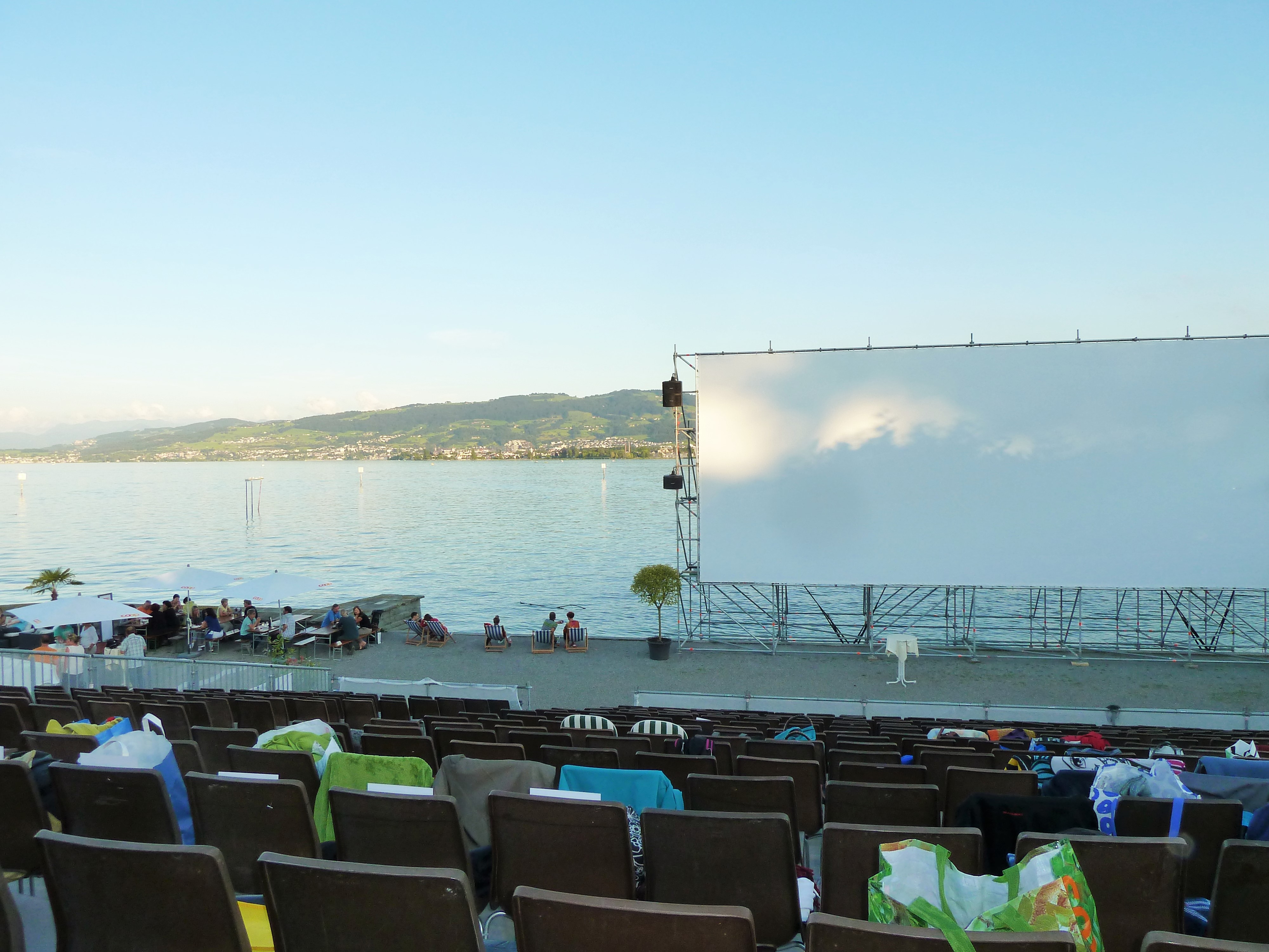 Vor Beginn der Vorstellung werden jeweils die Sitzplätze mit Decken und Jacken besetzt, und dann vergnügt sich das Publikum am Buffet oder geniesst die Aussicht und das Ambiente.