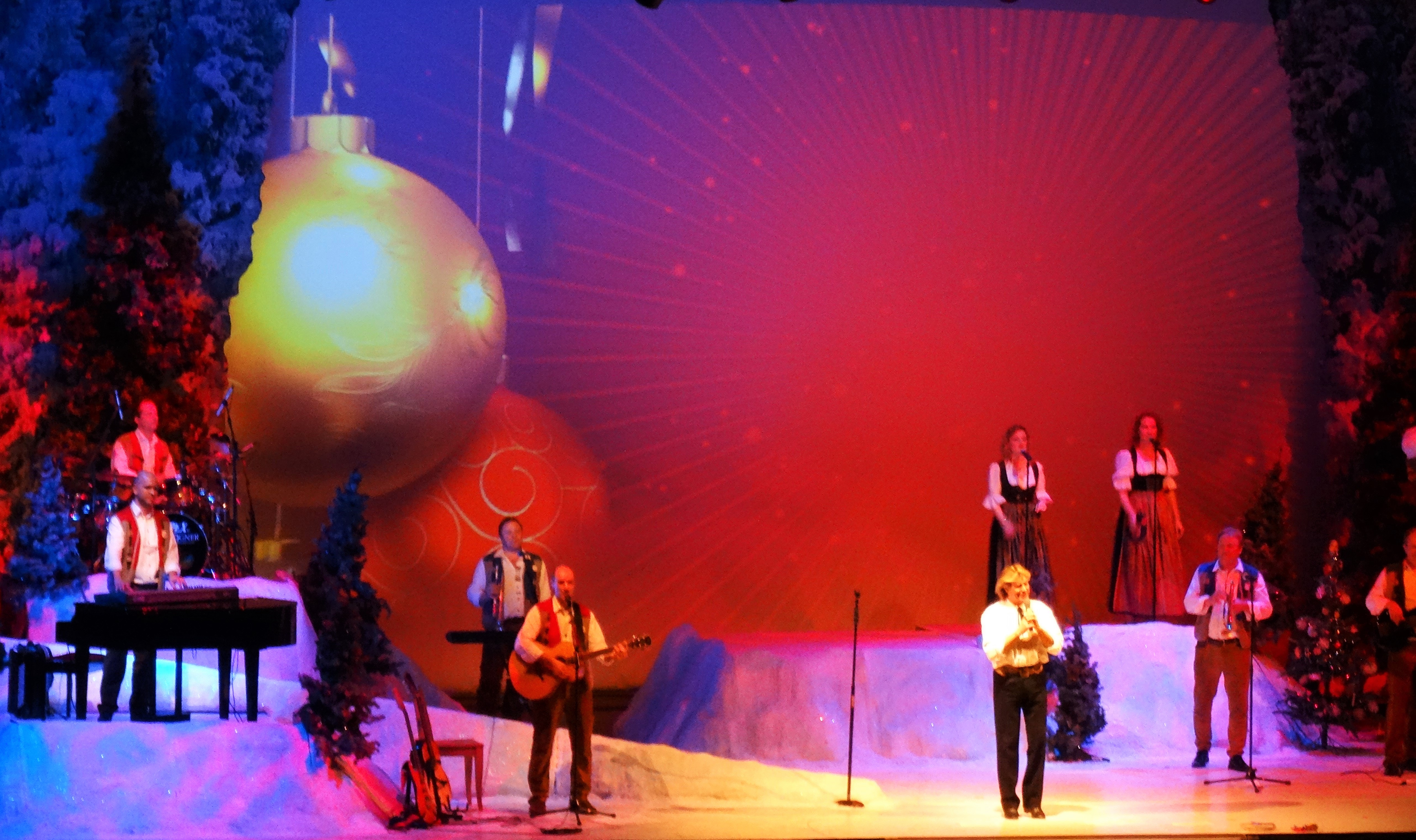 Mitte im Advent besuchte ich mit einer netten Begleitung das Weihnachtskonzert von Hansi Hinterseer, der vom Tiroler Echo begleitet wurde. Sie sangen und spielten weihnachtliche Melodien. Als Begleitinstrumente hörten wir Harfenklänge und Zithermusik. Als Kulisse wurden schon fast kitschig schöne Bilder gezeigt.