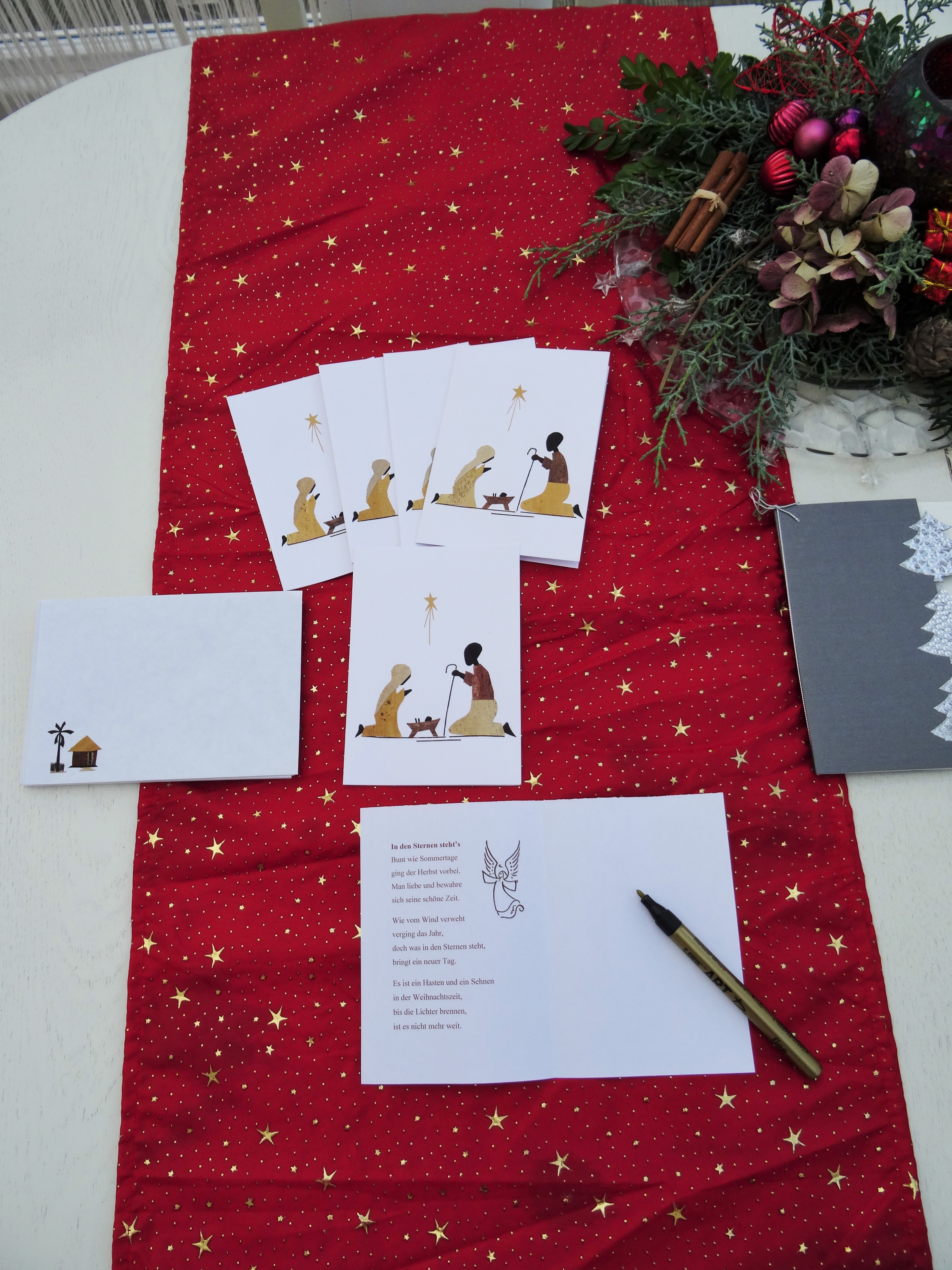 Ich habe handgefertigte Karten, die in Ruanda mit Maisblätter sehr filigran gestaltet werden, gekauft. Ich finde sie wunderschön und bewundere auch das Können.