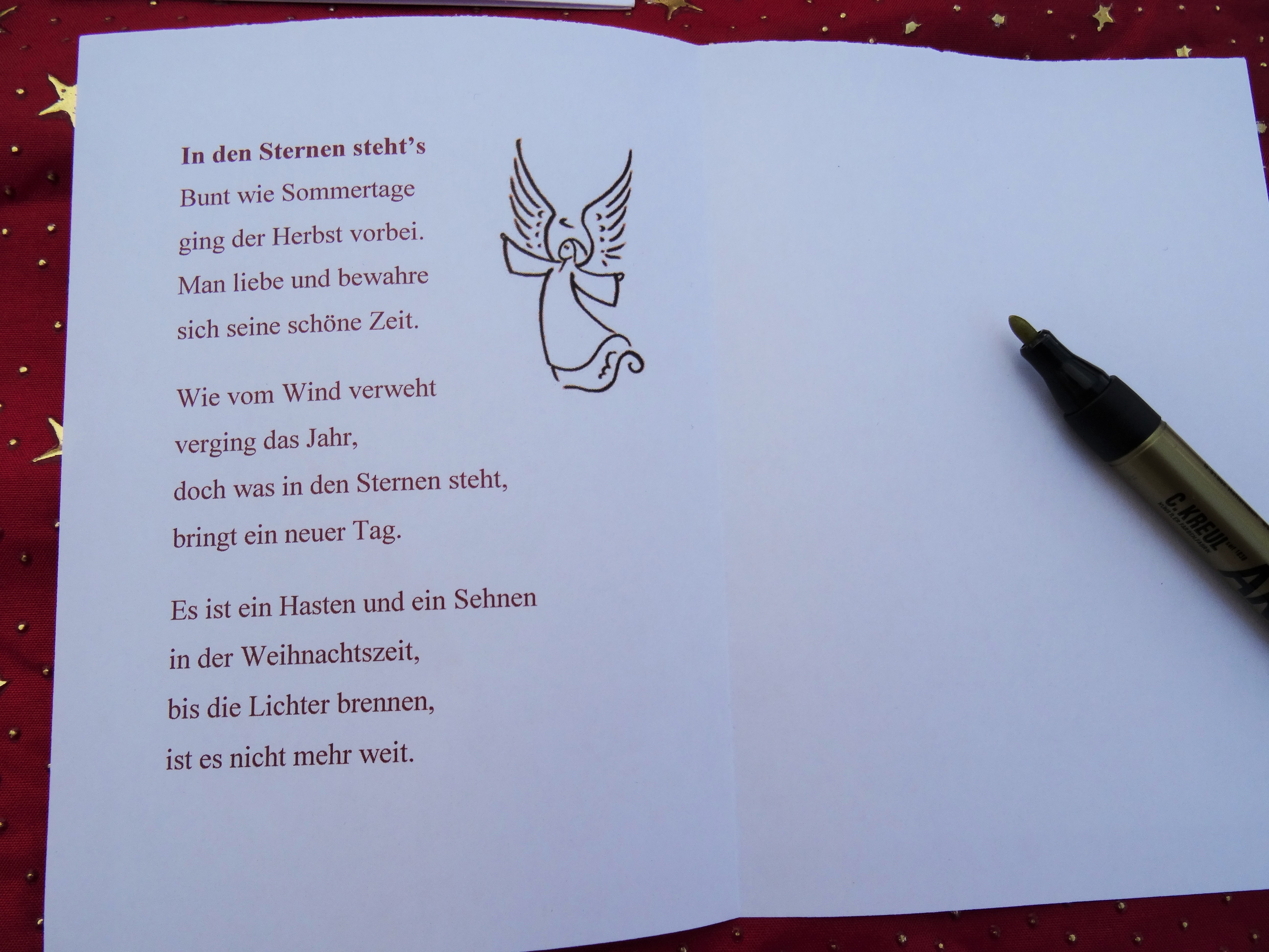 Dieses Jahr habe ich ein paar Zeilen, passend zu unserem wunderbaren Herbst, gefunden (leider weiss ich nicht mehr wer’s geschrieben hat). Ich fand das Gedicht sehr passend für die Einlageblätter.