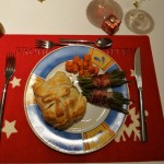 Rindsfilet mit beschwipsten Aprikosen und Leckerli, eingepackt in Blätterteig. Dazu Rüeblisternli und Bohnenpäckli.