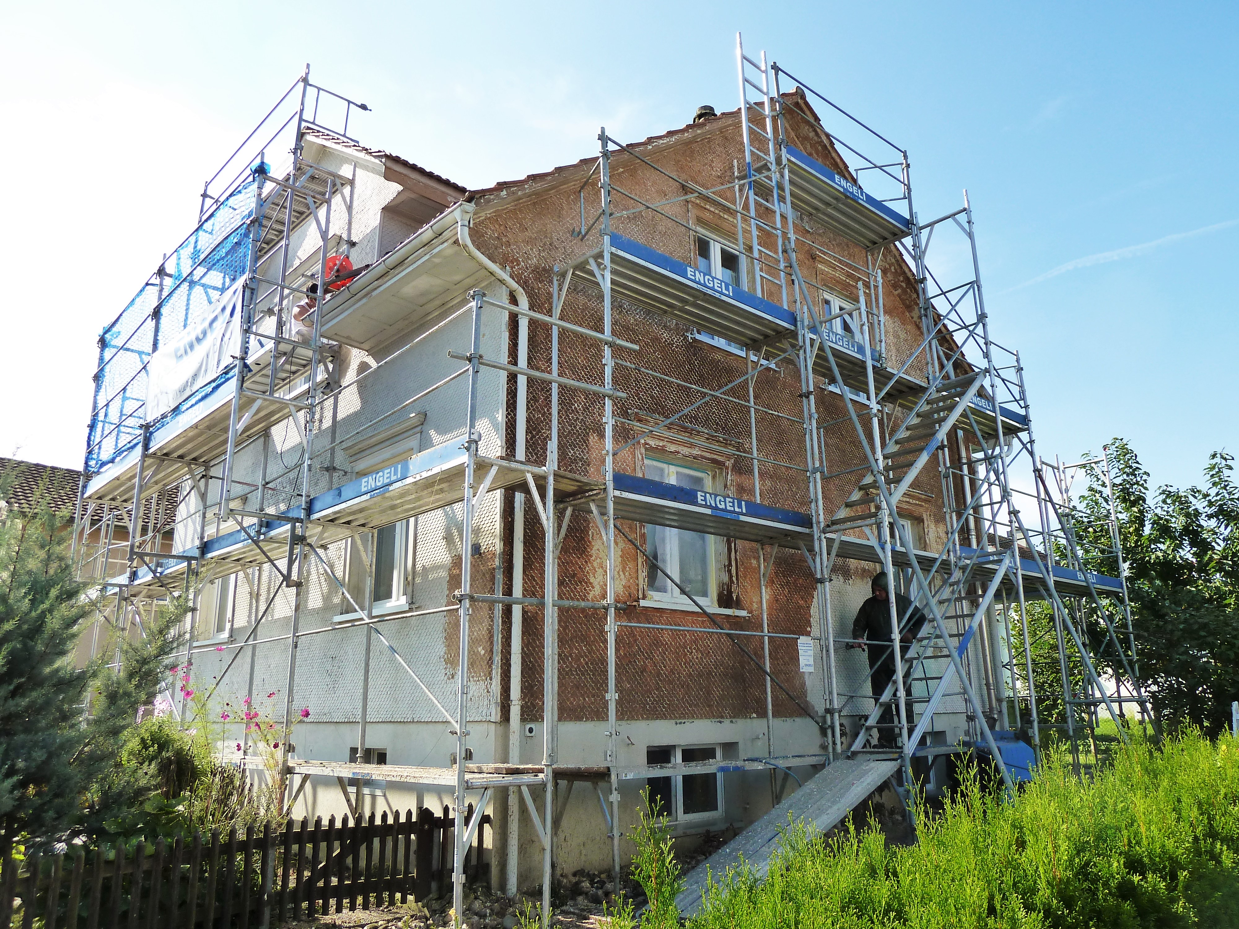 Rund um unser Haus steht ein Gerüst und alle Fensterläden sind abmontiert. Es wird geschliffen, mit dem Hochdruckreiniger die alte Farbe von der Fassade abgespritzt und auf dem Gerüst laufen die Arbeiter vor unseren Fenstern durch. Das heisst für mich, keine freie Sicht aus dem Fenster. Das engt ein und nimmt Licht weg.